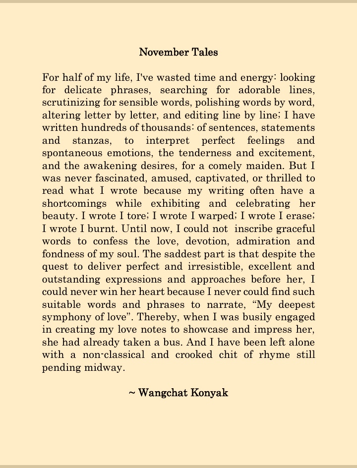For half of my life, I've wasted time and energy: looking for delicate phrases, searching for adorable lines, scrutinizing for sensible words, polishing words by word, altering letter by letter, and editing line by line; I have written hundreds of thousands: of sentences, statements and stanzas, to interpret perfect feelings and spontaneous emotions, the tenderness and excitement, and the awakening desires, for a comely maiden. But I was never fascinated, amused, captivated, or thrilled to read what I wrote because my writing often have a shortcomings while exhibiting and celebrating her beauty. I wrote I tore; I wrote I warped; I wrote I erase; I wrote I burnt. Until now, I could not inscribe graceful words to confess the love, devotion, admiration and fondness of my soul. The saddest part is that despite the quest to deliver perfect and irresistible, excellent and outstanding expressions and approaches before her, I could never win her heart because I never could find such suitable words and phrases to narrate, "My deepest symphony of love". Thereby, when I was busily engaged in creating my love notes to showcase and impress her, she had already taken a bus. And I have been left alone with a non-classical and crooked chit of rhyme still pending midway.