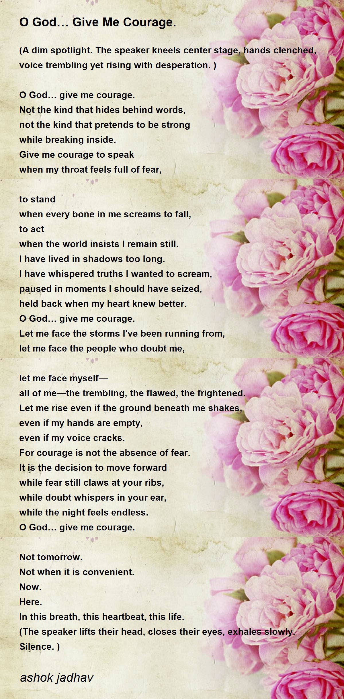(A dim spotlight. The speaker kneels center stage, hands clenched, voice trembling yet rising with desperation.)