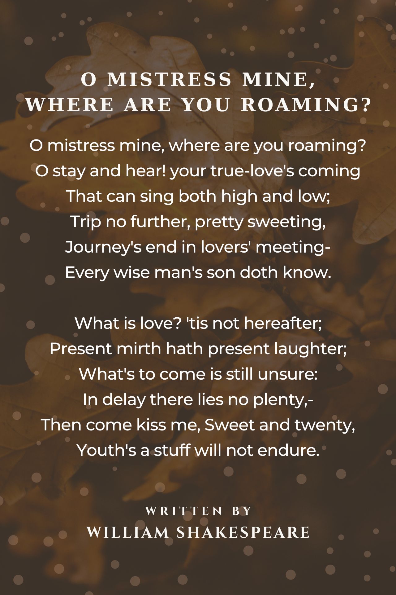 The opening line claim 'the mistress mine', asks where she is 'roaming' and moves into the next line which asks her to stay because, her 'true-love's coming'. The rendezvous is planned, the lovers are travelling to met, she is the 'pretty sweeting' and the desire is 'Journey's end in lovers' meeting'. This is Carpe Diem love, a poem about meeting the desired mistress for days of lustful loving, the loving is now and we should seize love, because love 'tis not hereafter; Present mirth hath present laughter; What's to come is' still unsure: ' thus love now intensely, live each all moments of love while we can. This sentiment is stated with 'In delay there lies no plenty, - ' and reinforced with 'Youth's a stuff will not endure.' We are told to love while young, make the most of youth and love, while we can.