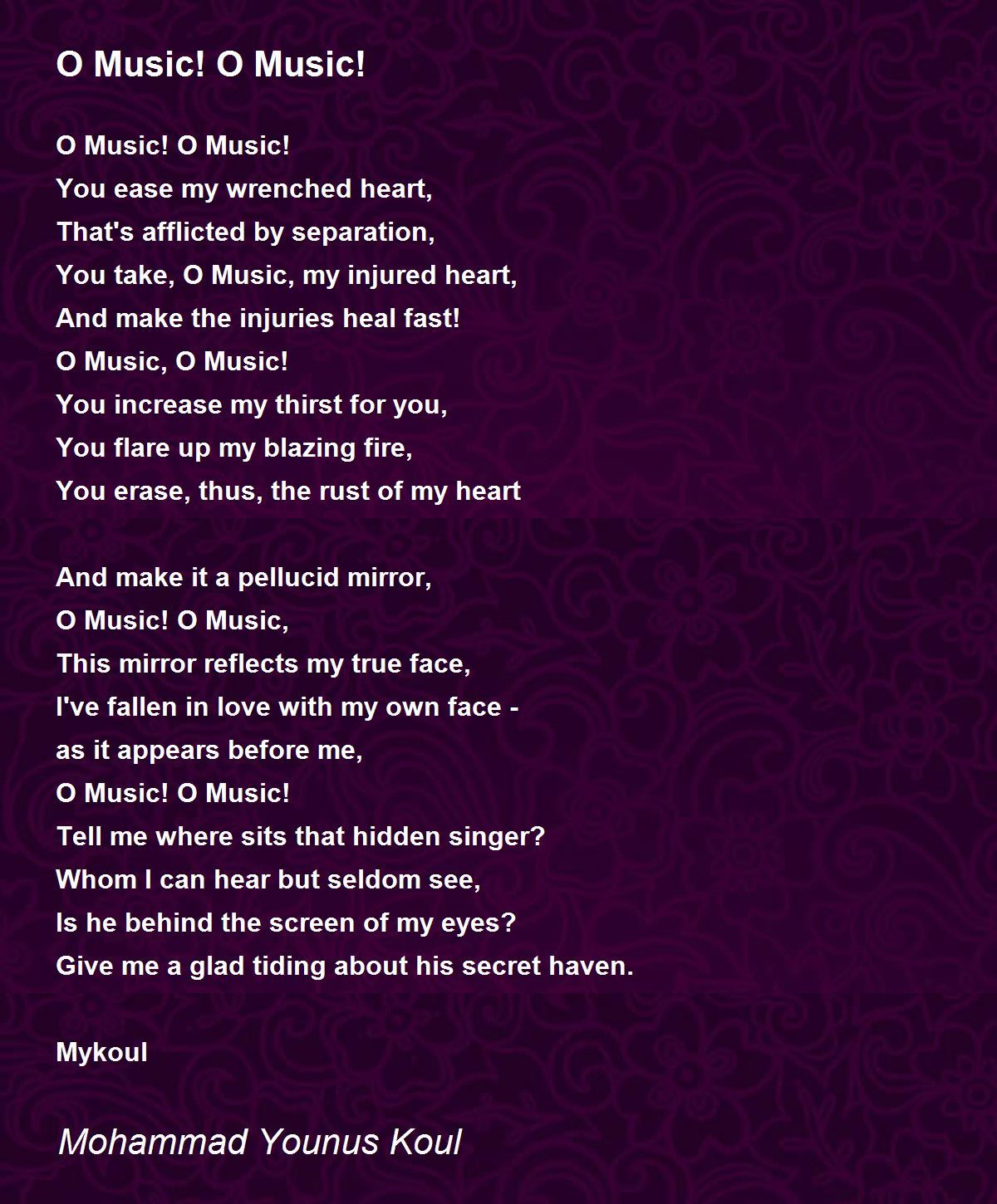 'O Music! O Music! Tell me where sits that hidden singer? Whom I can hear but seldom see, Is he behind the screen of my eyes? Give me a glad tiding about his secret haven.' - Love your mystic mind that produces such beautiful poems!