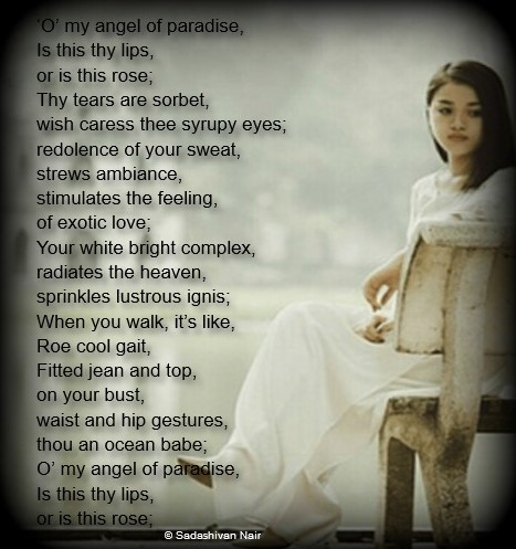 on your bust, waist and hip gestures, thou an ocean babe; O’ my angel of paradise, Is this thy lips, or is this rose; Expression of great wonder at the sight of your fascination..... love your poem. thank you dear poet. tony