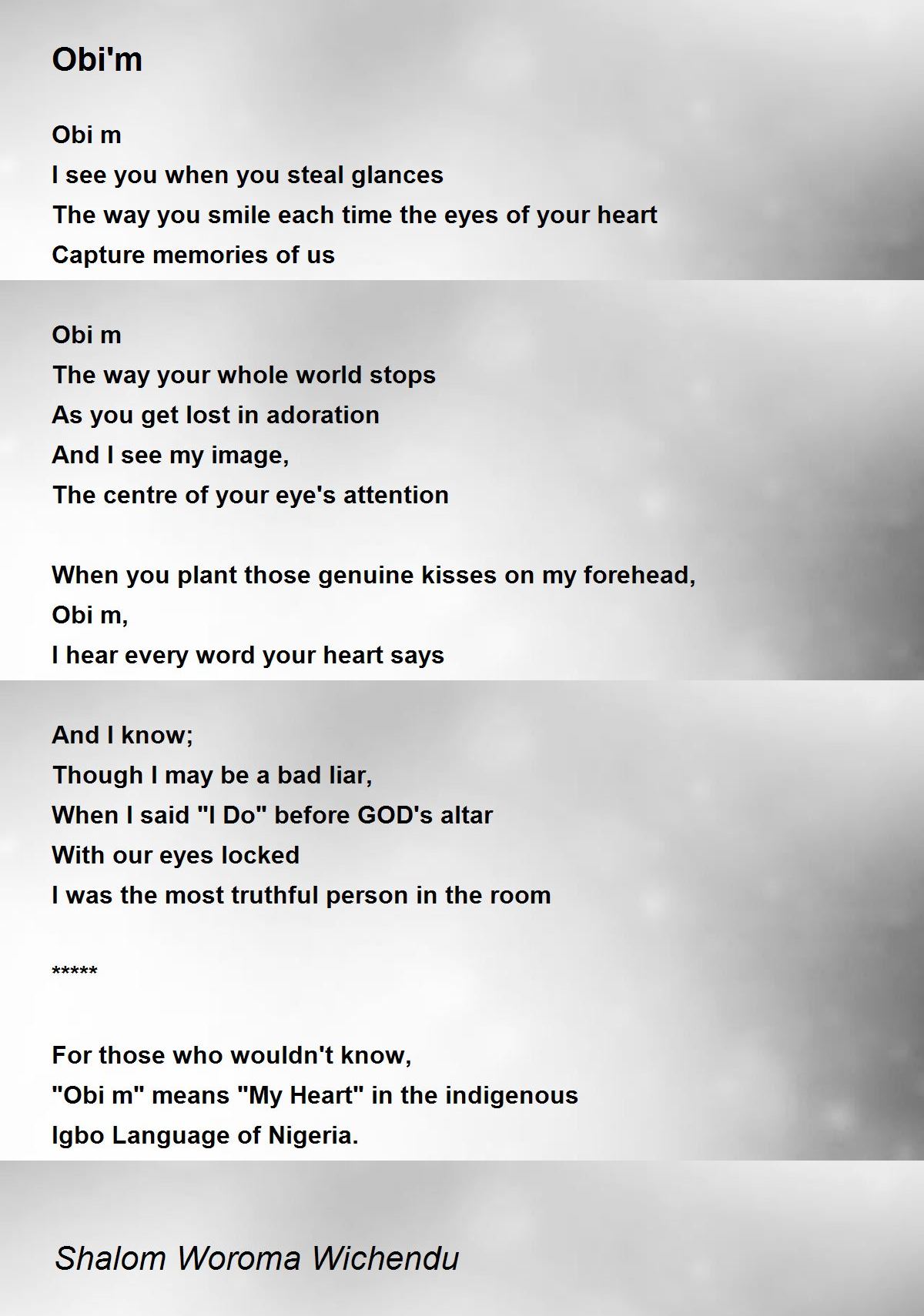 "Obi m" means "My Heart" in the indigenous Igbo Language of Nigeria.