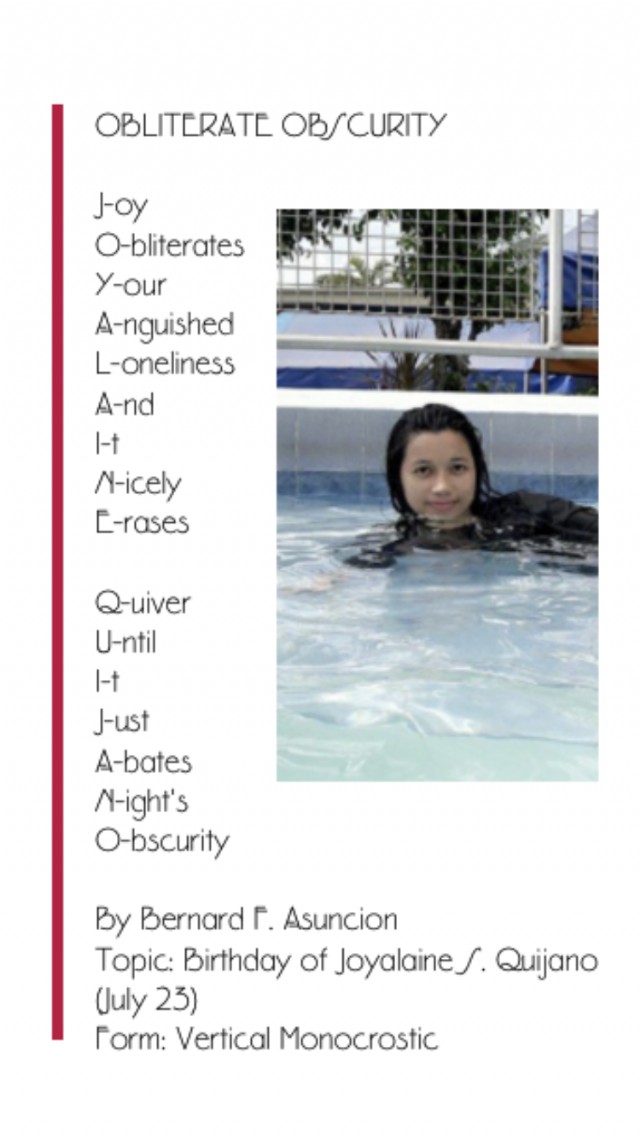 Topic: Birthday of Joyalaine S. Quijano (July 23)