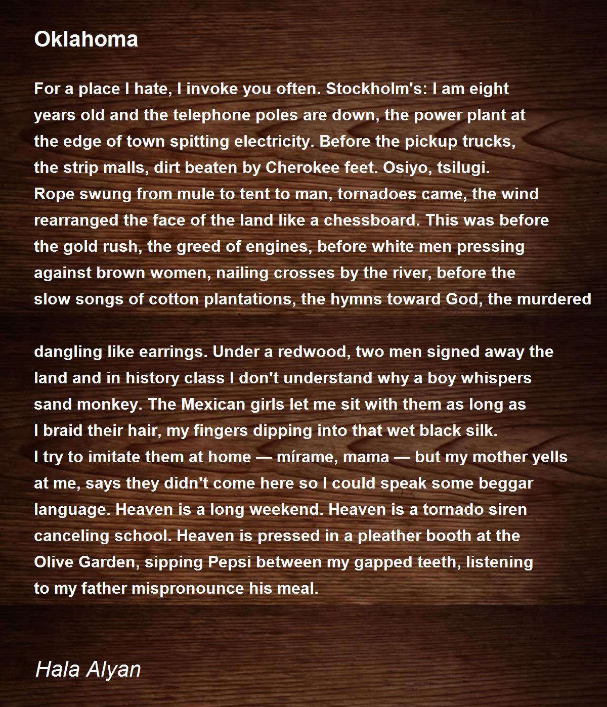 For a place I hate, I invoke you often. Stockholm's: I am eight years old and the telephone poles are down, the power plant at the edge of town spitting electricity. Before the pickup trucks, the strip malls, dirt beaten by Cherokee feet. Osiyo, tsilugi. Rope swung from mule to tent to man, tornadoes came, the wind rearranged the face of the land like a chessboard. This was before the gold rush, the greed of engines, before white men pressing against brown women, nailing crosses by the river, before the slow songs of cotton plantations, the hymns toward God, the murdered dangling like earrings. Under a redwood, two men signed away the land and in history class I don't understand why a boy whispers sand monkey. The Mexican girls let me sit with them as long as I braid their hair, my fingers dipping into that wet black silk. I try to imitate them at home — mírame, mama — but my mother yells at me, says they didn't come here so I could speak some beggar language. Heaven is a long weekend. Heaven is a tornado siren canceling school. Heaven is pressed in a pleather booth at the Olive Garden, sipping Pepsi between my gapped teeth, listening to my father mispronounce his meal.