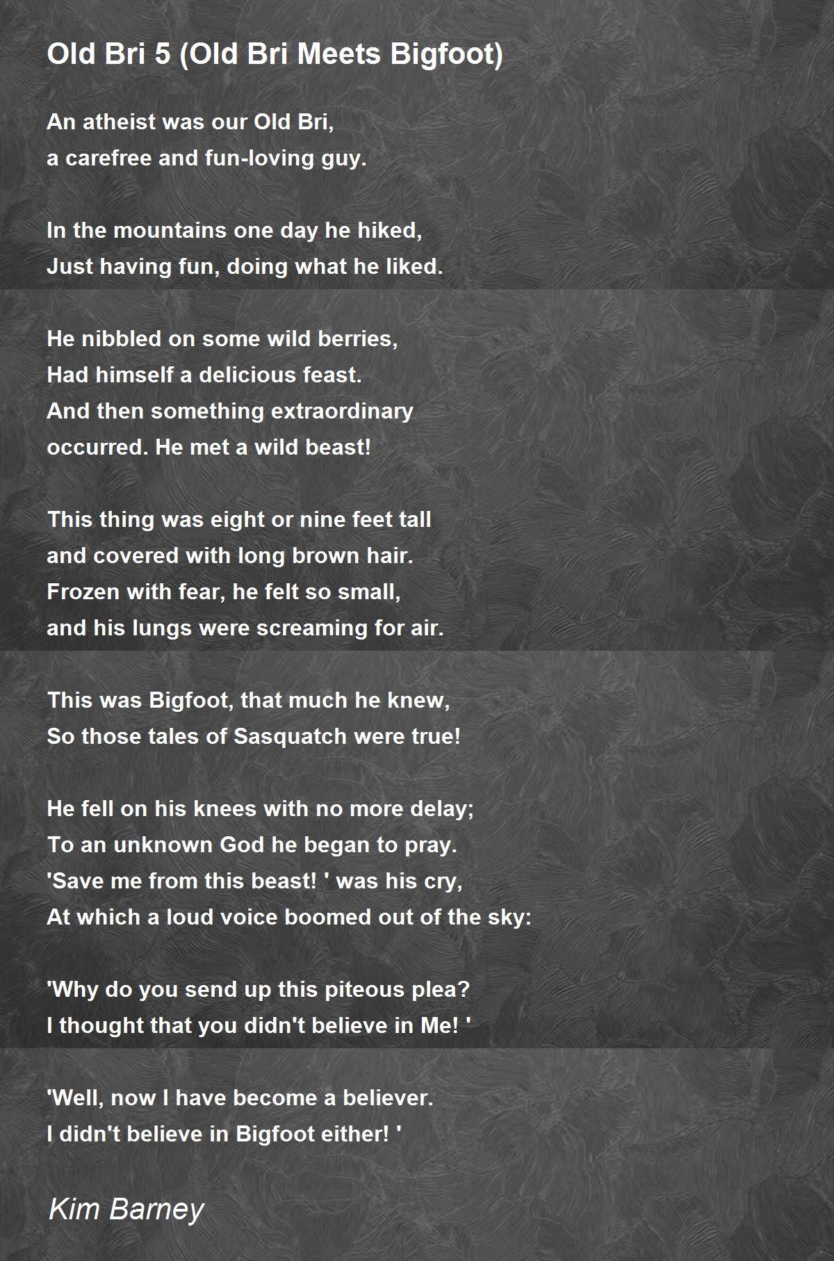 gads! ! ! ! a treasure trove for me to delve into another day. i make reference to your poet's notes, kind sir. i have just started to read Old Bri Meets...... perhaps you meant Virile Bri Meets.....? ? my little one-stanza guess at how your poem might run was 'close' to how yours starts out! i live in Bigfoot Country, northern California, home to Redwood and other trees on many hills on either side of route 101. i had seen carvings representing Bigfoot but i'd yet to have the pleasure of meeting him, ...until recently. ok, to finish the poem and get on with business! ok, done. the ending gave me a chuckle. yes, i didn't really believe in either, till that fateful day. now that i've met Bigfoot [and shared a few beers with him; he is rather personable] i DO believe in him. i'm still, however waiting for a face-to-face meeting with God. i was just kidding when i pretended to pray. i was trying to distract the beast. he, Bigfoot aka Sasquatch, thought it quite hilarious and gave me a great big Bigfoot hug. bri ;) i read Wes Vogler's comment. i didn't realize he was fond of me. then again, he may not have been including himself in the some of us. hee- hee. bri :) of course this must go to MyPoemList. and, though you, Kim, rarely, if ever, have offered your works for one of my/our showcases on my site, you are welcome to have this one be in Feb.2017's showcase..............., not that many seem to read it! ! ! bri :)
