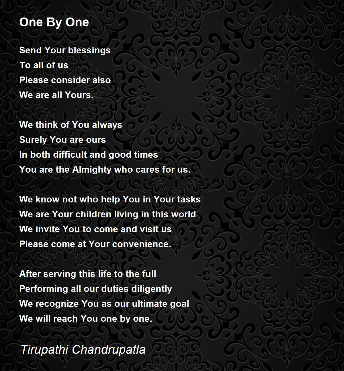 After serving this life to the full Performing all our duties diligently We recognize You as our ultimate goal We will reach You one by one.......outstanding conceptualization. Beautiful poem.