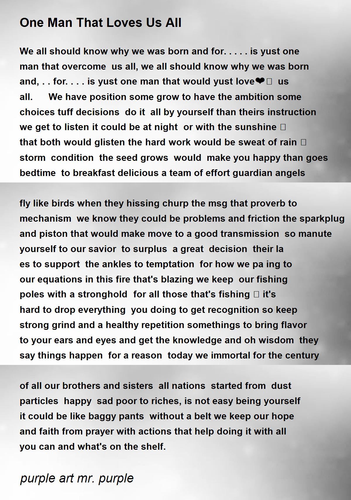 We all should know why we was born and for.....is yust one man that overcome us all, we all should know why we was born and, .. for.... is yust one man that would yust love❤️ us all. We have position some grow to have the ambition some choices tuff decisions do it all by yourself than theirs instruction we get to listen it could be at night or with the sunshine 🌞 that both would glisten the hard work would be sweat of rain 🌧 storm condition the seed grows would make you happy than goes bedtime to breakfast delicious a team of effort guardian angels fly like birds when they hissing churp the msg that proverb to mechanism we know they could be problems and friction the sparkplug and piston that would make move to a good transmission so manute yourself to our savior to surplus a great decision their la es to support the ankles to temptation for how we pa ing to our equations in this fire that's blazing we keep our fishing poles with a stronghold for all those that's fishing 🎣 it's hard to drop everything you doing to get recognition so keep strong grind and a healthy repetition somethings to bring flavor to your ears and eyes and get the knowledge and oh wisdom they say things happen for a reason today we immortal for the century of all our brothers and sisters all nations started from dust particles happy sad poor to riches, is not easy being yourself it could be like baggy pants without a belt we keep our hope and faith from prayer with actions that help doing it with all you can and what's on the shelf.