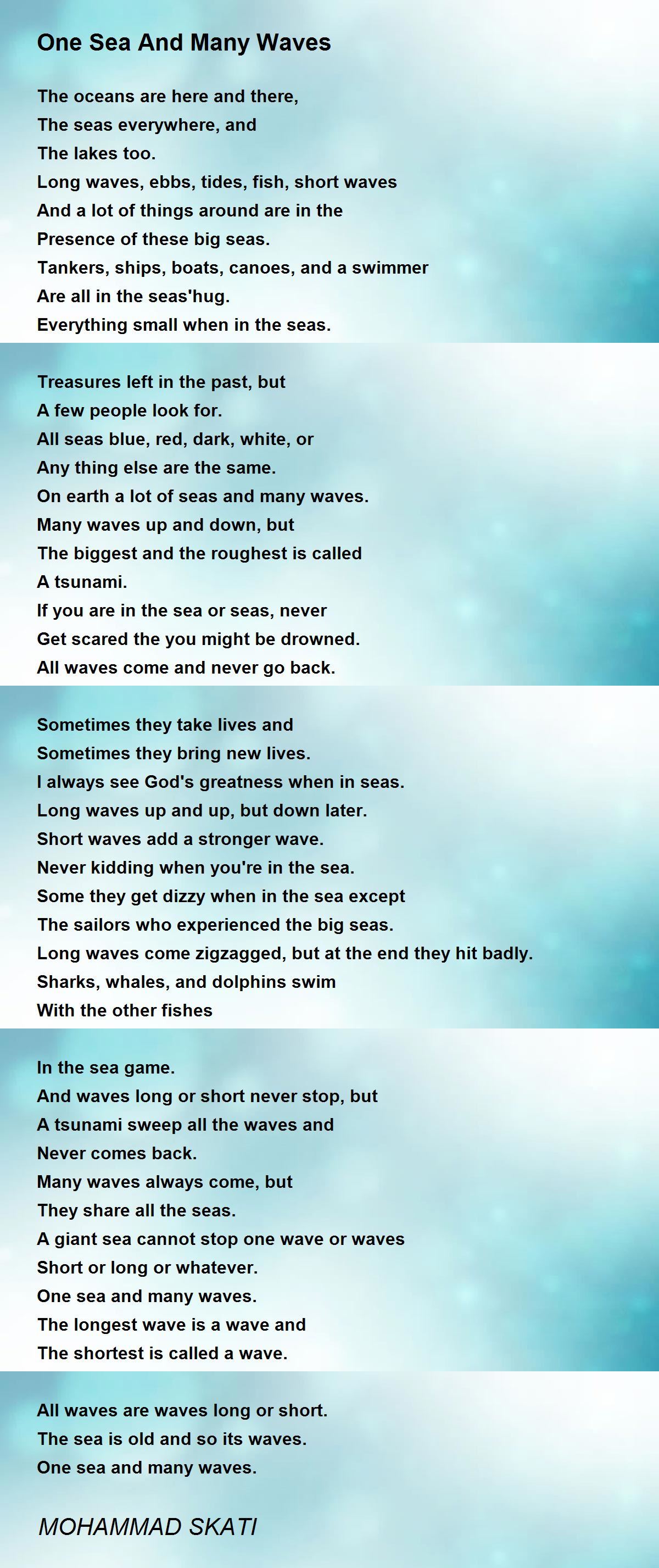 The oceans are here and there, The seas everywhere, and The lakes too. Long waves, ebbs, tides, fish, short waves And a lot of things around are in the Presence of these big seas. Tankers, ships, boats, canoes, and a swimmer Are all in the seas'hug. Everything small when in the seas. Treasures left in the past, but A few people look for. All seas blue, red, dark, white, or Any thing else are the same. On earth a lot of seas and many waves. Many waves up and down, but The biggest and the roughest is called A tsunami. If you are in the sea or seas, never Get scared the you might be drowned. All waves come and never go back. Sometimes they take lives and Sometimes they bring new lives. I always see God's greatness when in seas. Long waves up and up, but down later. Short waves add a stronger wave. Never kidding when you're in the sea. Some they get dizzy when in the sea except The sailors who experienced the big seas. Long waves come zigzagged, but at the end they hit badly. Sharks, whales, and dolphins swim With the other fishes In the sea game. And waves long or short never stop, but A tsunami sweep all the waves and Never comes back. Many waves always come, but They share all the seas. A giant sea cannot stop one wave or waves Short or long or whatever. One sea and many waves. The longest wave is a wave and The shortest is called a wave. All waves are waves long or short. The sea is old and so its waves. One sea and many waves.