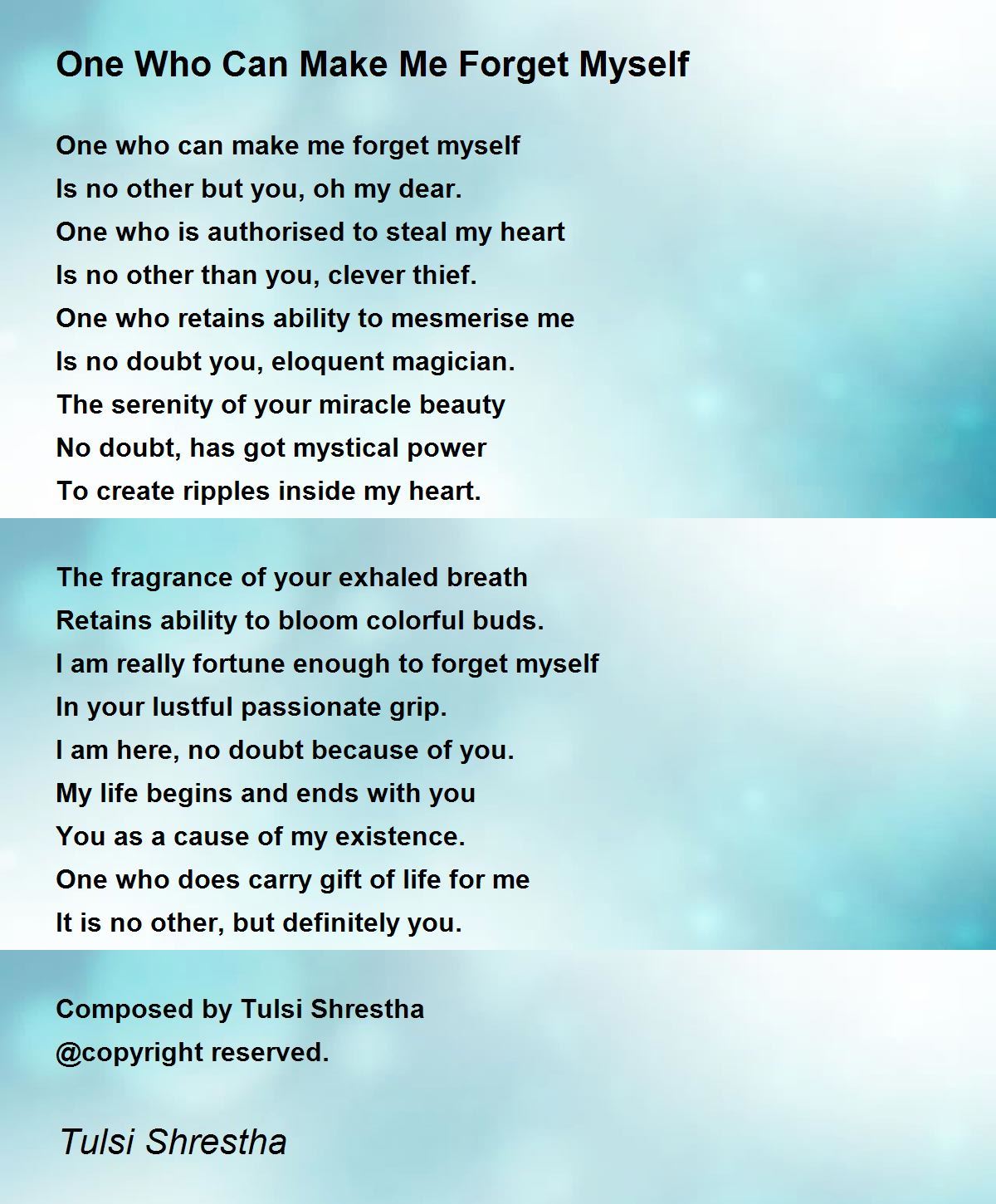 I am here, no doubt because of you. My life begins and ends with you You as a cause of my existence........deepness of love is well executed here. Beautiful poem. Thank you dear Tulsi for sharing this gem.
