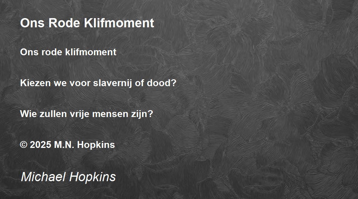 Opmerking: Dit gedicht is geïnspireerd, geschreven in de haiku-stijl en vandaag,27 januari 2025, voor het eerst gepubliceerd. Het is geïnspireerd door het verhaal van deze strijd, waarin een volk weigerde zich te onderwerpen aan de heerschappij van anderen. Het trof me dat misschien veel landen in de wereld zich op dit moment op een rood klif bevinden en geen keuze hebben tussen onderwerping aan een wereldwijde, gecentraliseerde heerschappij of het behoud van hun soevereiniteit als volk met een eigen cultuur en tradities. Rode Klif aan het IJsselmeer Deze klif is gemaakt van keileem en is vernoemd naar de kleur van de klei. Rode keileem komt alleen voor in Gaasterland in Nederland. De klif is beroemd omdat hier in 1345 de Slag bij Warns plaatsvond. De slag wordt herdacht door de grote kei. De inscriptie op de kei, ‘Leaver dea as slaaf' (beter dood dan slaaf) , spreekt voor zich.