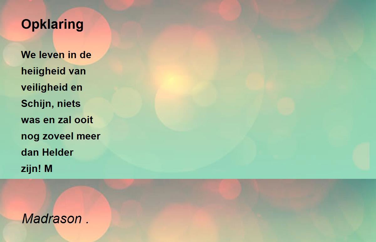 We leven in de heiigheid van veiligheid en Schijn, niets was en zal ooit nog zoveel meer dan Helder zijn! M