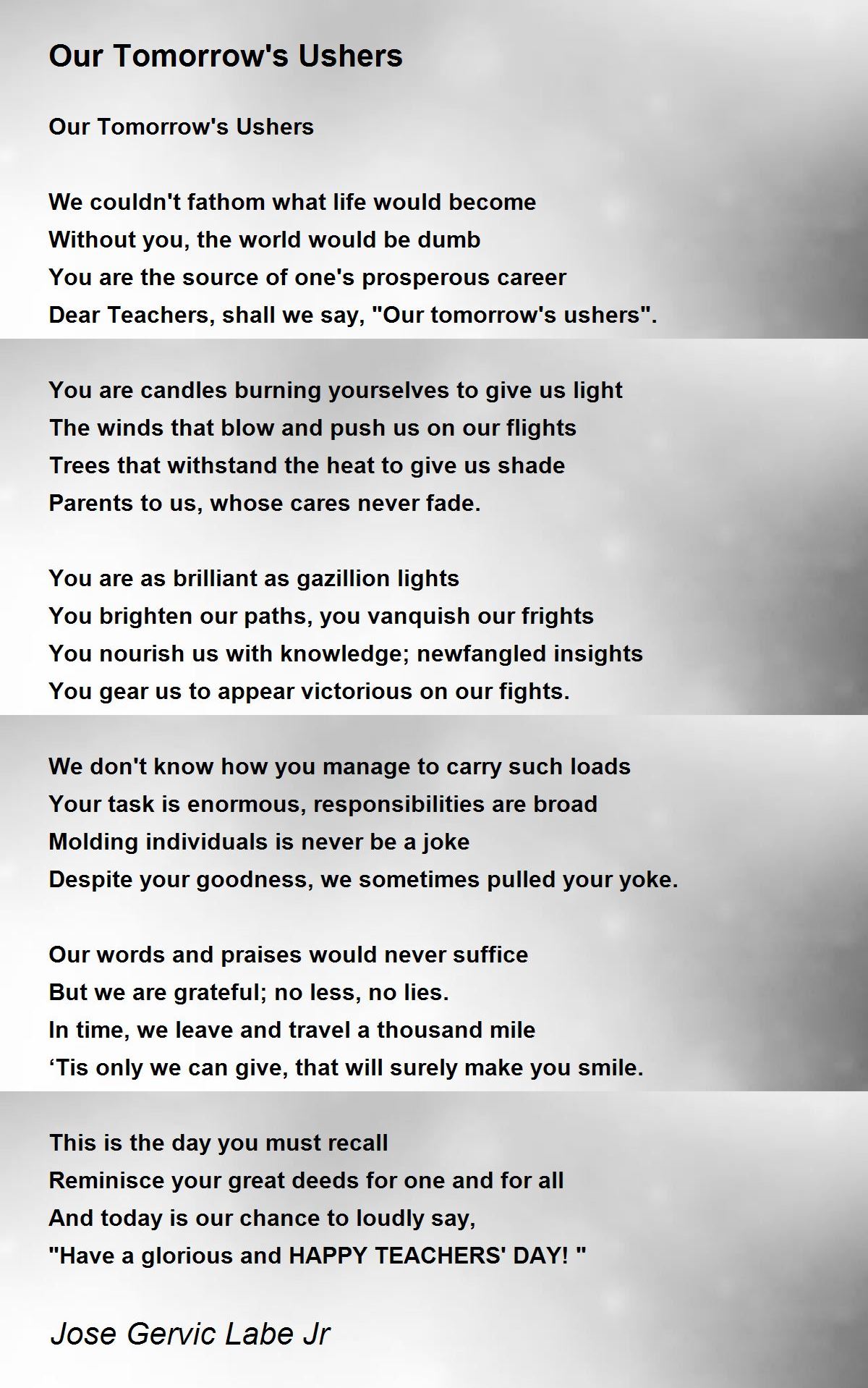 Dear Teachers, shall we say, "Our tomorrow's ushers".