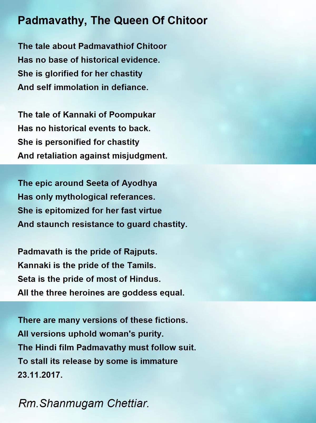 Padmavath is the pride of Rajputs. Kannaki is the pride of the Tamils. Seta is the pride of most of Hindus. All the three heroines are goddess equal... . yes sir, so true. It is a beautiful historical poem that glorifies the chastity and purity of three women. Haunting expression. Thank you dear Chettiar for nice sharing.