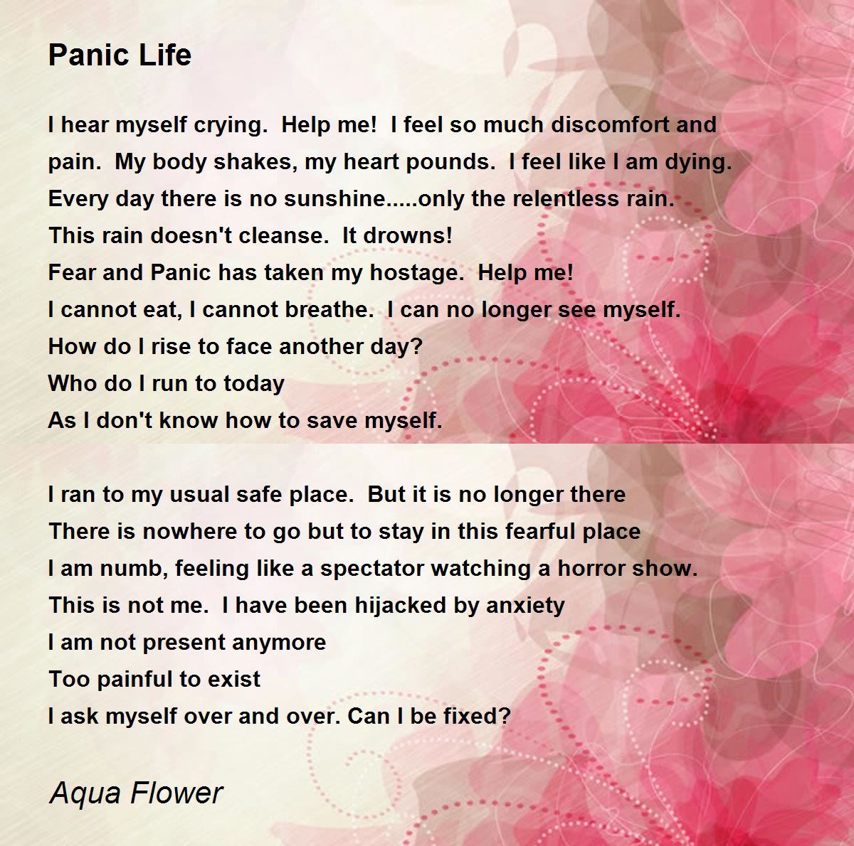 A vivid expression of pains and anguish of a panic stricken person. Counselling, care and empathy as well as proper understanding by family members will surely help him to come out of darkness.