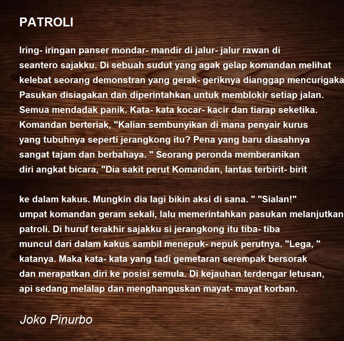 Iring-iringan panser mondar-mandir di jalur-jalur rawan di seantero sajakku. Di sebuah sudut yang agak gelap komandan melihat kelebat seorang demonstran yang gerak- geriknya dianggap mencurigakan. Pasukan disiagakan dan diperintahkan untuk memblokir setiap jalan. Semua mendadak panik. Kata-kata kocar-kacir dan tiarap seketika. Komandan berteriak, "Kalian sembunyikan di mana penyair kurus yang tubuhnya seperti jerangkong itu? Pena yang baru diasahnya sangat tajam dan berbahaya." Seorang peronda memberanikan diri angkat bicara, "Dia sakit perut Komandan, lantas terbirit-birit ke dalam kakus. Mungkin dia lagi bikin aksi di sana." "Sialan!" umpat komandan geram sekali, lalu memerintahkan pasukan melanjutkan patroli. Di huruf terakhir sajakku si jerangkong itu tiba-tiba muncul dari dalam kakus sambil menepuk-nepuk perutnya. "Lega," katanya. Maka kata-kata yang tadi gemetaran serempak bersorak dan merapatkan diri ke posisi semula. Di kejauhan terdengar letusan, api sedang melalap dan menghanguskan mayat-mayat korban.