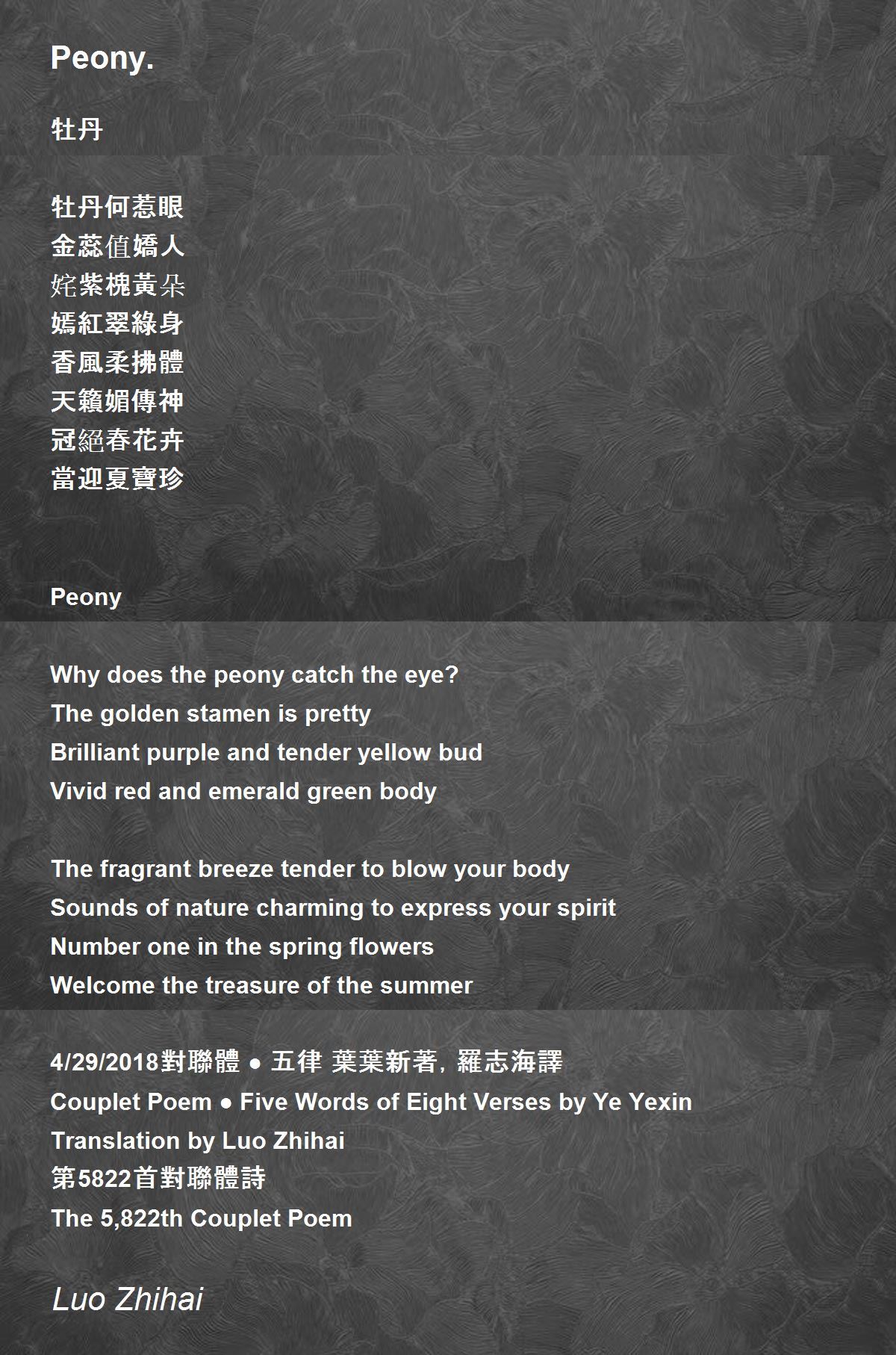 4/29/2018對聯體 ● 五律 葉葉新著,羅志海譯