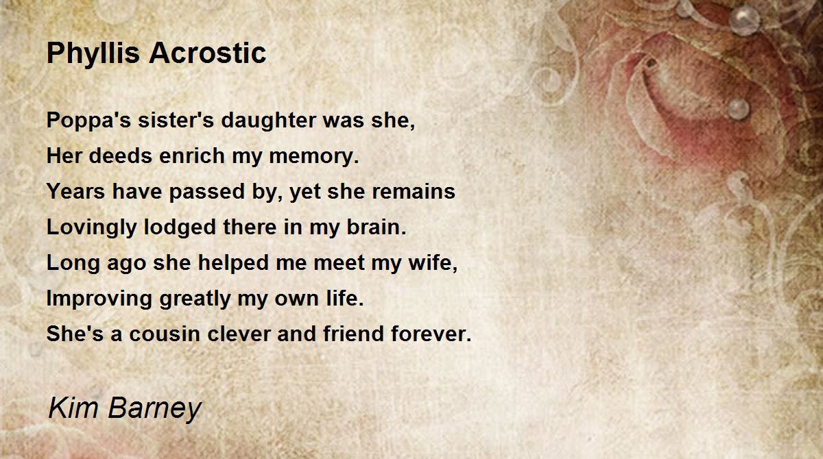 I was zooming through your list of poems to gather the ones for June's showcase, and this poem's title caught my eye. so i backed up, but it really did NOT say syphilis, like i thought it had. that really happened; no offense meant. i called a female cousin today who was once MORE than a cousin and friend. i like this poem and that Phyllis did such a good deed for you years ago. a friend urged ME to look online for my 4th wife (8 years ago) so i guess i have him to blame............ i mean thank...........for that! gotta get back to what i was up to, but maybe i'll get to your 'lost poems' some day, especially if you send it to me. i CAN'T ignore my messages. i wouldn't be able to sleep at night. well, at least I could eat; nothing stops THAT! bri :)