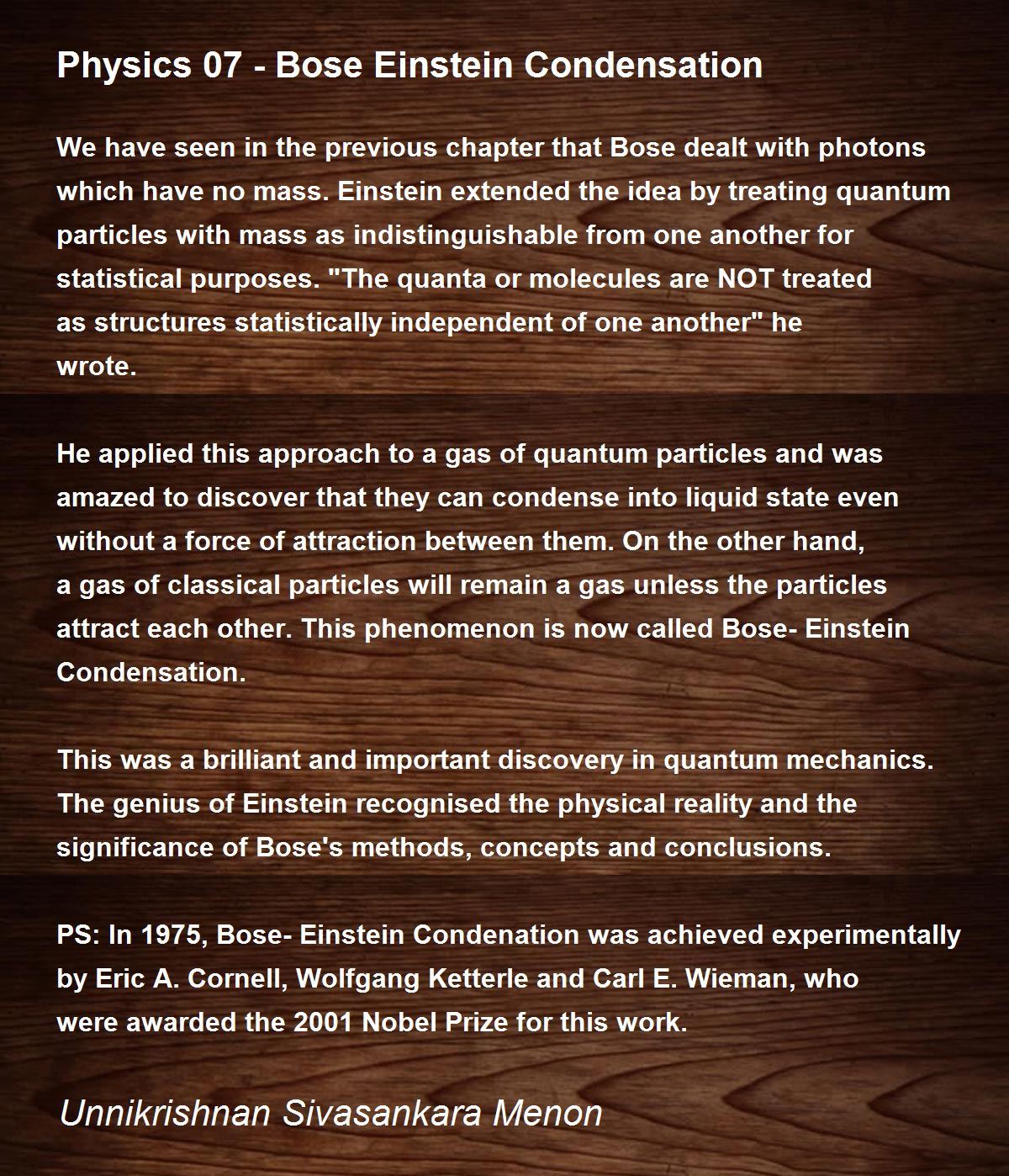 PS: In 1975, Bose-Einstein Condenation was achieved experimentally by Eric A. Cornell, Wolfgang Ketterle and Carl E. Wieman, who were awarded the 2001 Nobel Prize for this work.