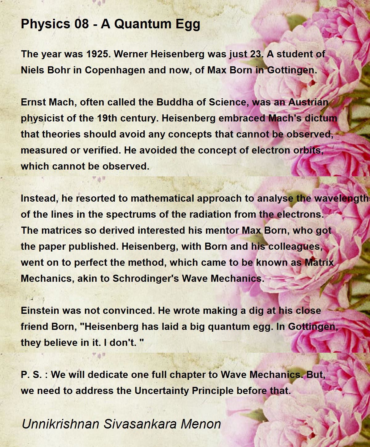 Instead, he resorted to mathematical approach to analyse the wavelengths of the lines in the spectrums of the radiation from the electrons. The matrices so derived interested his mentor Max Born, who got the paper published. Heisenberg, with Born and his colleagues, went on to perfect the method, which came to be known as Matrix Mechanics, akin to Schrodinger's Wave Mechanics.