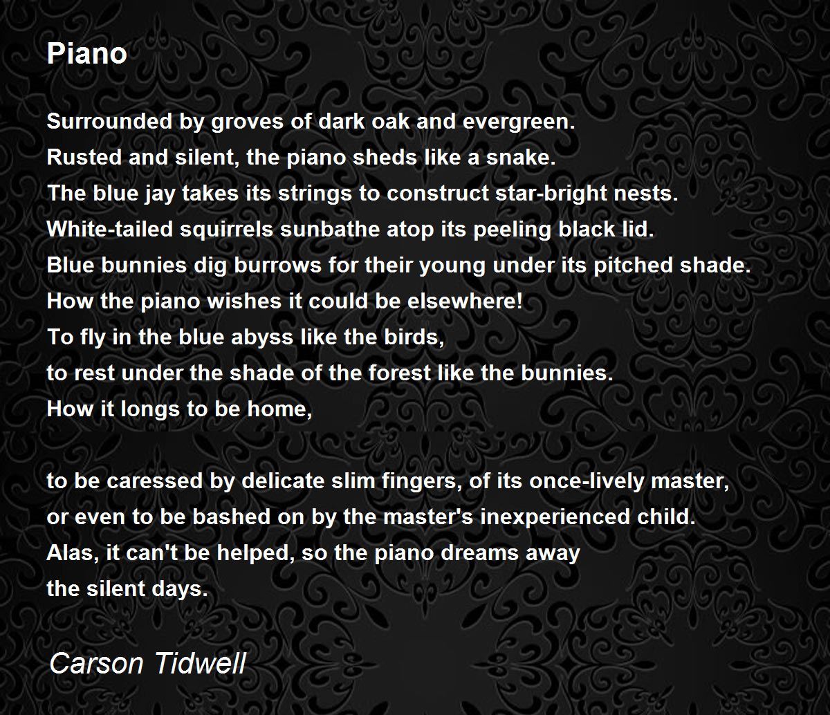 How it longs to be home, to be caressed by delicate slim fingers, of its once-lively master, or even to be bashed on by the master's inexperienced child. Piano as a symbol to portray the inner loneliness..... and love....... than ku. wonderful imagination my dear poet. tony