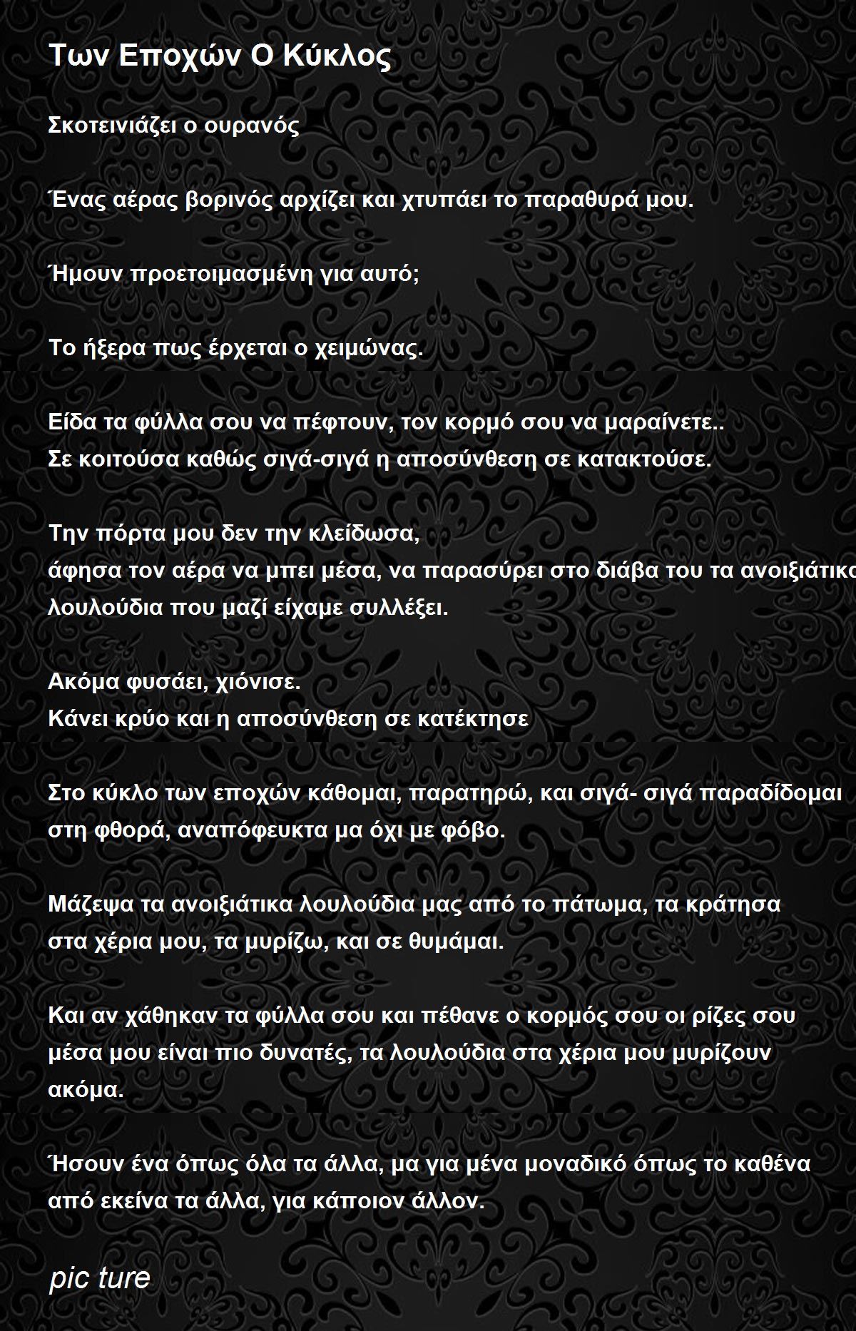 Στο κύκλο των εποχών κάθομαι, παρατηρώ, και σιγά-σιγά παραδίδομαι στη φθορά, αναπόφευκτα μα όχι με φόβο.