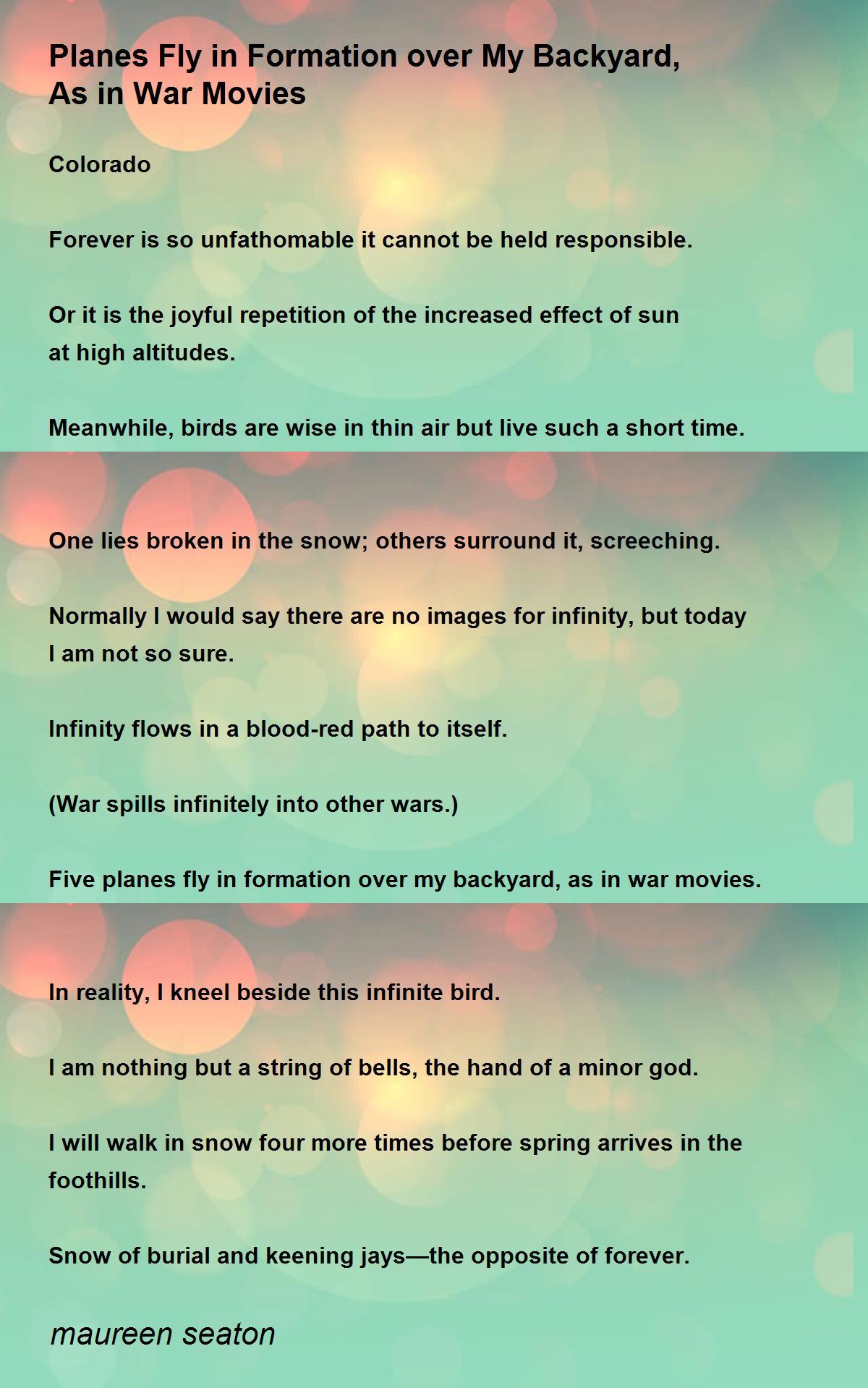 Five planes fly in formation over my backyard, as in war movies.
