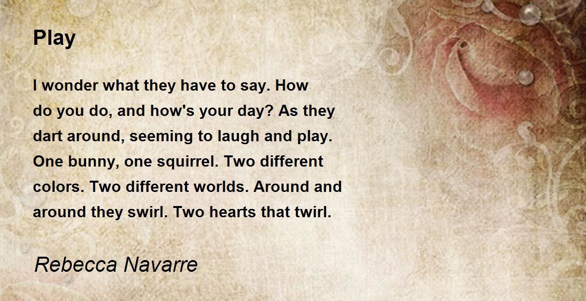 Addition: The two seem also playful. In playing and laughing they can get along. You have created a true adventurous poem to ponder upon, dear Becca, so loveliest! A 10+++++++++++++++++++++++ The title says it all: PLAY. I have enjoyed again a very lot. Thank you for sharing, Becca! God's greatest Blessings fall upon you and your beloved family.