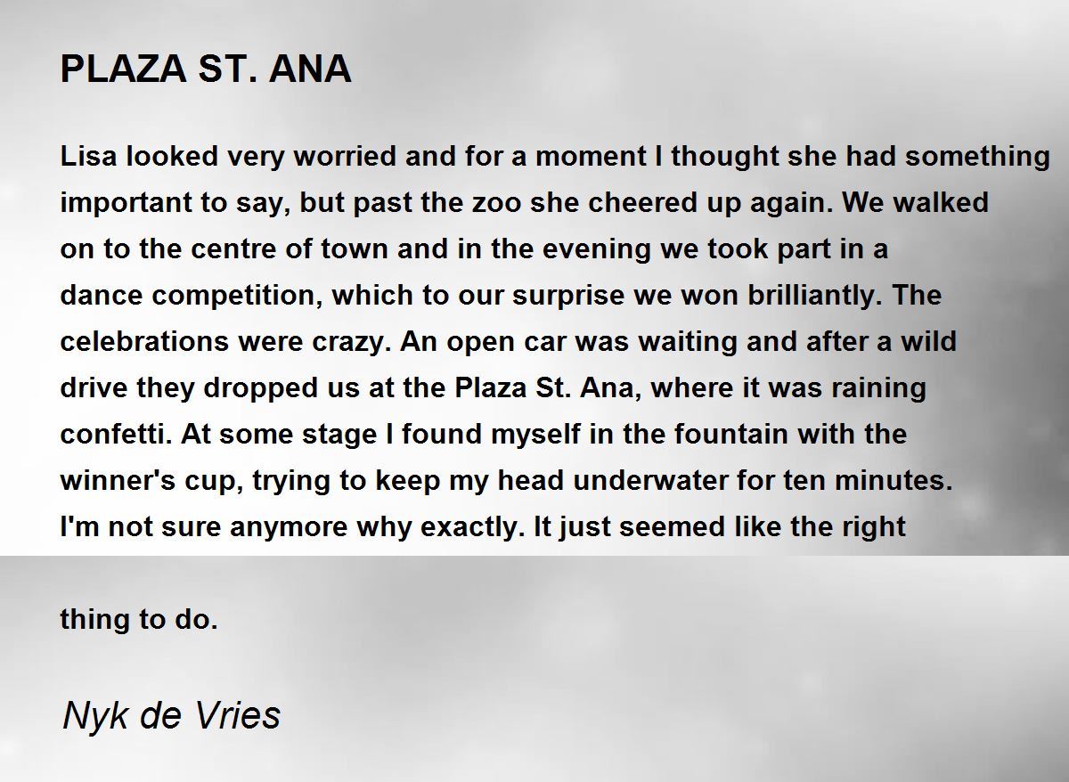 Lisa looked very worried and for a moment I thought she had something important to say, but past the zoo she cheered up again. We walked on to the centre of town and in the evening we took part in a dance competition, which to our surprise we won brilliantly. The celebrations were crazy. An open car was waiting and after a wild drive they dropped us at the Plaza St. Ana, where it was raining confetti. At some stage I found myself in the fountain with the winner's cup, trying to keep my head underwater for ten minutes. I'm not sure anymore why exactly. It just seemed like the right thing to do.