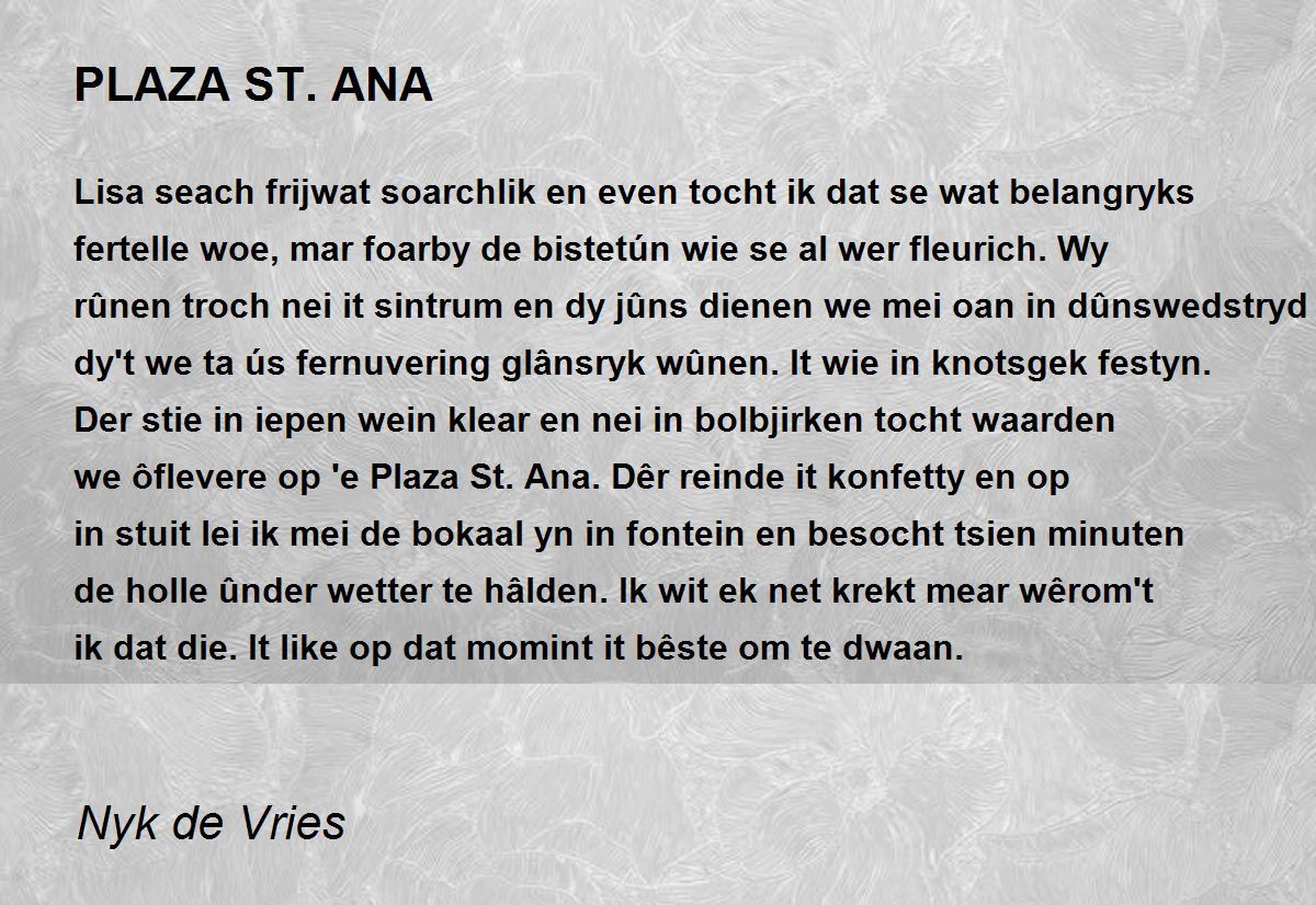 Lisa seach frijwat soarchlik en even tocht ik dat se wat belangryks fertelle woe, mar foarby de bistetún wie se al wer fleurich. Wy rûnen troch nei it sintrum en dy jûns dienen we mei oan in dûnswedstryd dy't we ta ús fernuvering glânsryk wûnen. It wie in knotsgek festyn. Der stie in iepen wein klear en nei in bolbjirken tocht waarden we ôflevere op 'e Plaza St. Ana. Dêr reinde it konfetty en op in stuit lei ik mei de bokaal yn in fontein en besocht tsien minuten de holle ûnder wetter te hâlden. Ik wit ek net krekt mear wêrom't ik dat die. It like op dat momint it bêste om te dwaan.