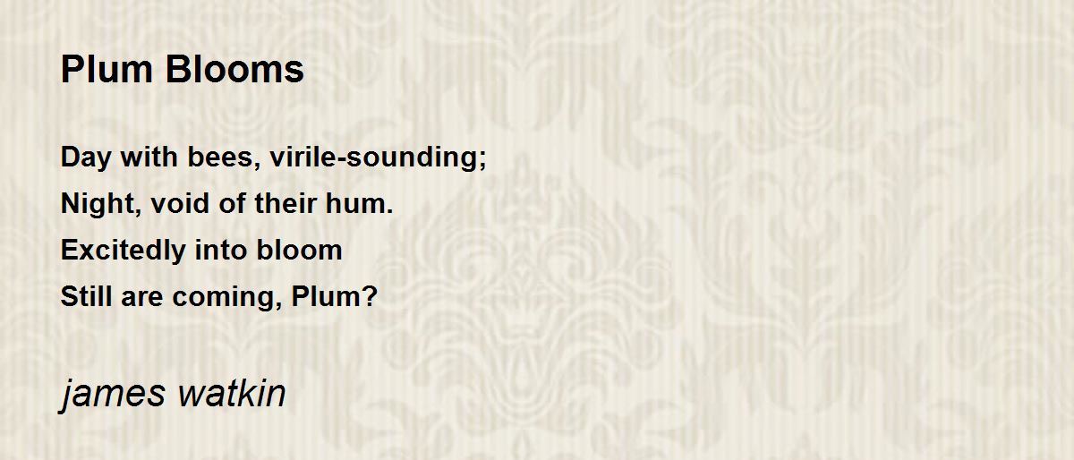 Day with bees, virile-sounding; Night, void of their hum. Excitedly into bloom Still are coming, Plum?