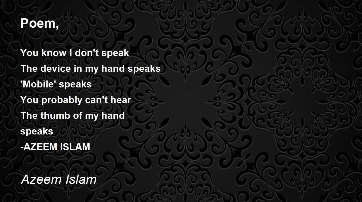 You know I don't speakThe device in my hand speaks 'Mobile' speaksYou probably can't hearThe thumb of my handspeaks-AZEEM ISLAM