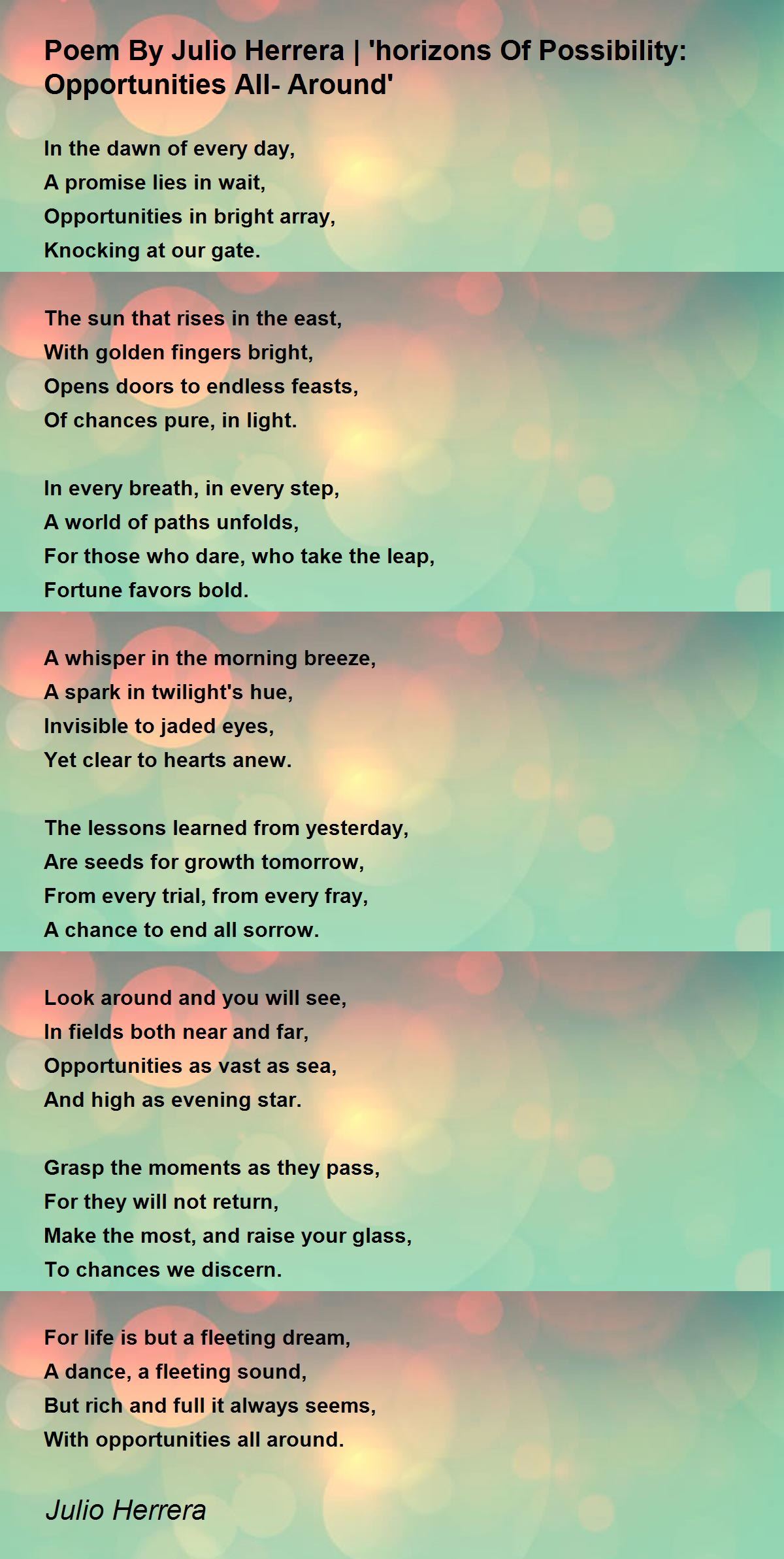 Hi Julio, The Poem is so motivational that teaches us life moral values. Thanks for sharing the poem.