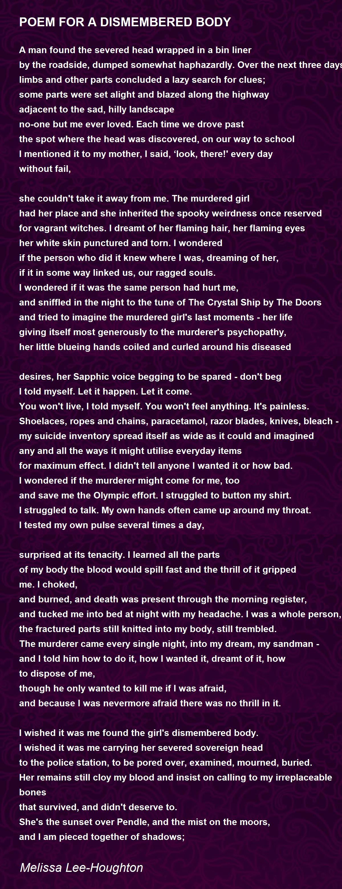 resembling dismembered parts, dancing with what will be my corpse, and I do not know