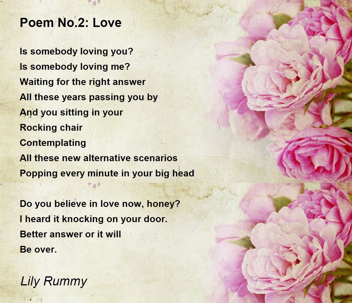 If we don't answer the door for love. It will leave us. I enjoyed your words and thoughts about love. Thank you Lily for sharing the amazing poetry.