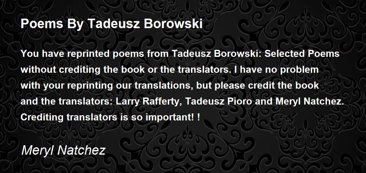 You have reprinted poems from Tadeusz Borowski: Selected Poems without crediting the book or the translators. I have no problem with your reprinting our translations, but please credit the book and the translators: Larry Rafferty, Tadeusz Pioro and Meryl Natchez. Crediting translators is so important! !