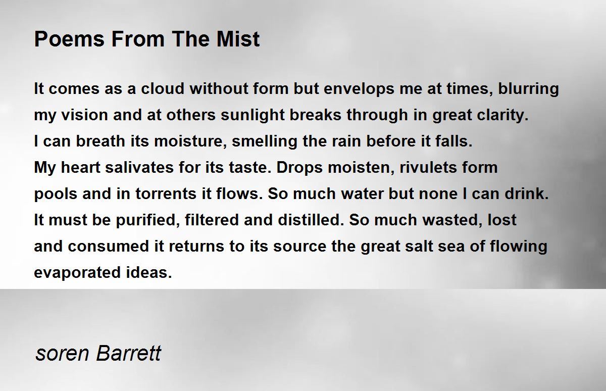 It comes as a cloud without form but envelops me at times, blurring my vision and at others sunlight breaks through in great clarity. I can breath its moisture, smelling the rain before it falls. My heart salivates for its taste. Drops moisten, rivulets form pools and in torrents it flows. So much water but none I can drink. It must be purified, filtered and distilled. So much wasted, lost and consumed it returns to its source the great salt sea of flowing evaporated ideas.