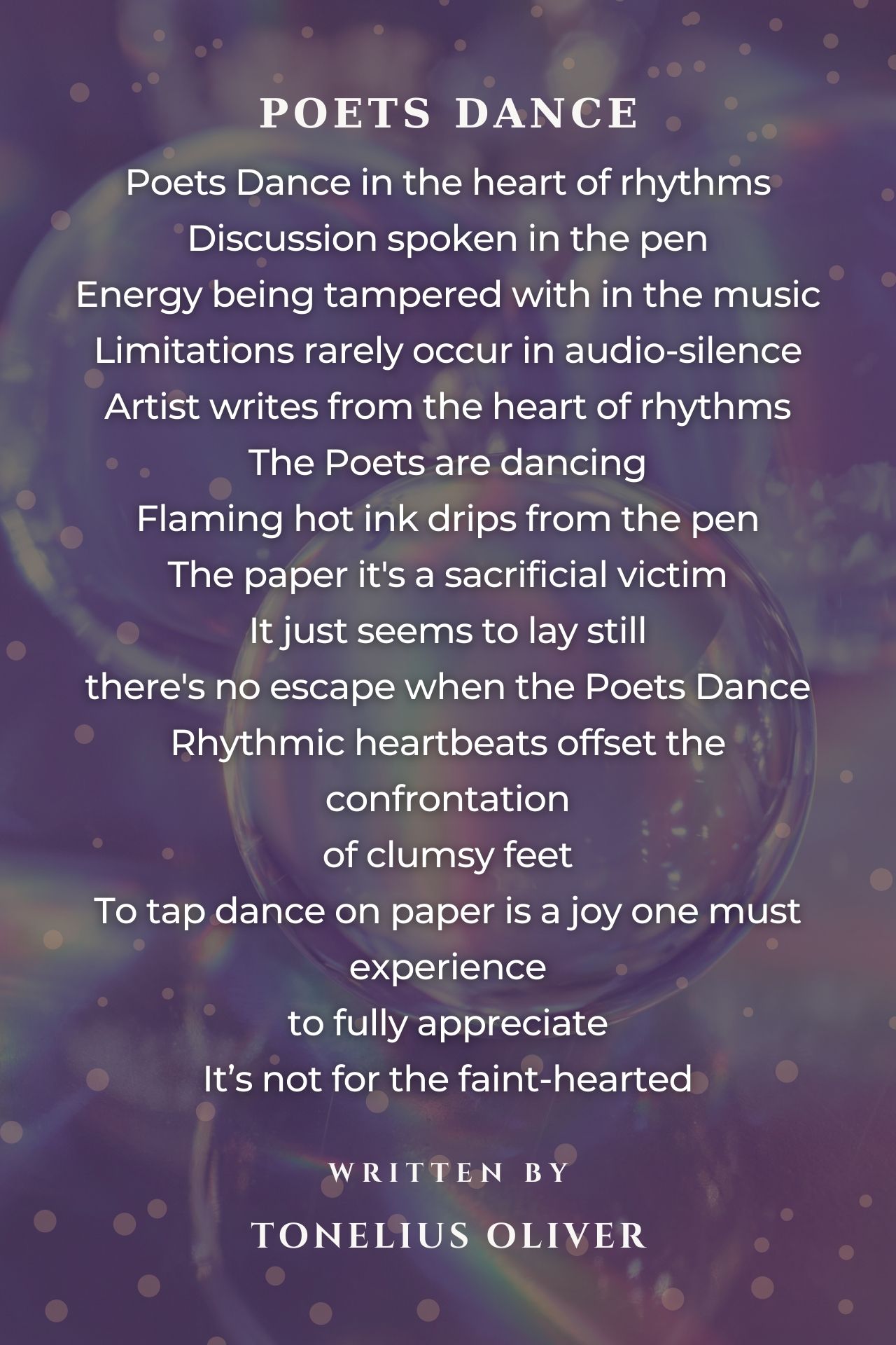 The Poets are dancing Flaming hot ink drips from the pen The paper it's a sacrificial victim It just seems to lay still there's no escape when the Poets Dance Rhythmic heartbeats offset the confrontation of clumsy feet great write great 10+++++++++++++++++++
