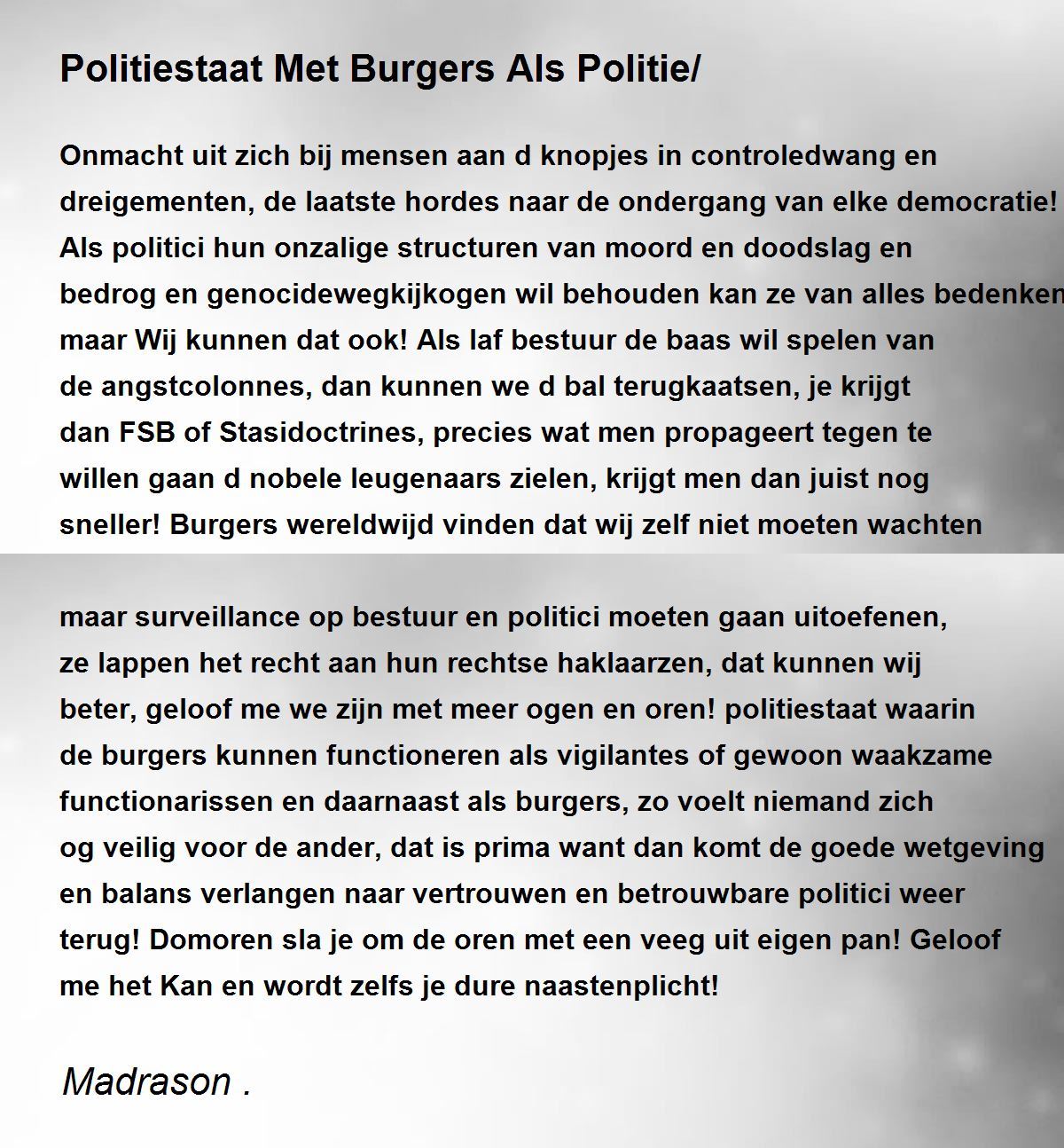 Onmacht uit zich bij mensen aan d knopjes in controledwang en dreigementen, de laatste hordes naar de ondergang van elke democratie! Als politici hun onzalige structuren van moord en doodslag en bedrog en genocidewegkijkogen wil behouden kan ze van alles bedenken maar Wij kunnen dat ook! Als laf bestuur de baas wil spelen van de angstcolonnes, dan kunnen we d bal terugkaatsen, je krijgt dan FSB of Stasidoctrines, precies wat men propageert tegen te willen gaan d nobele leugenaars zielen, krijgt men dan juist nog sneller! Burgers wereldwijd vinden dat wij zelf niet moeten wachten maar surveillance op bestuur en politici moeten gaan uitoefenen, ze lappen het recht aan hun rechtse haklaarzen, dat kunnen wij beter, geloof me we zijn met meer ogen en oren! politiestaat waarin de burgers kunnen functioneren als vigilantes of gewoon waakzame functionarissen en daarnaast als burgers, zo voelt niemand zich og veilig voor de ander, dat is prima want dan komt de goede wetgeving en balans verlangen naar vertrouwen en betrouwbare politici weer terug! Domoren sla je om de oren met een veeg uit eigen pan! Geloof me het Kan en wordt zelfs je dure naastenplicht!