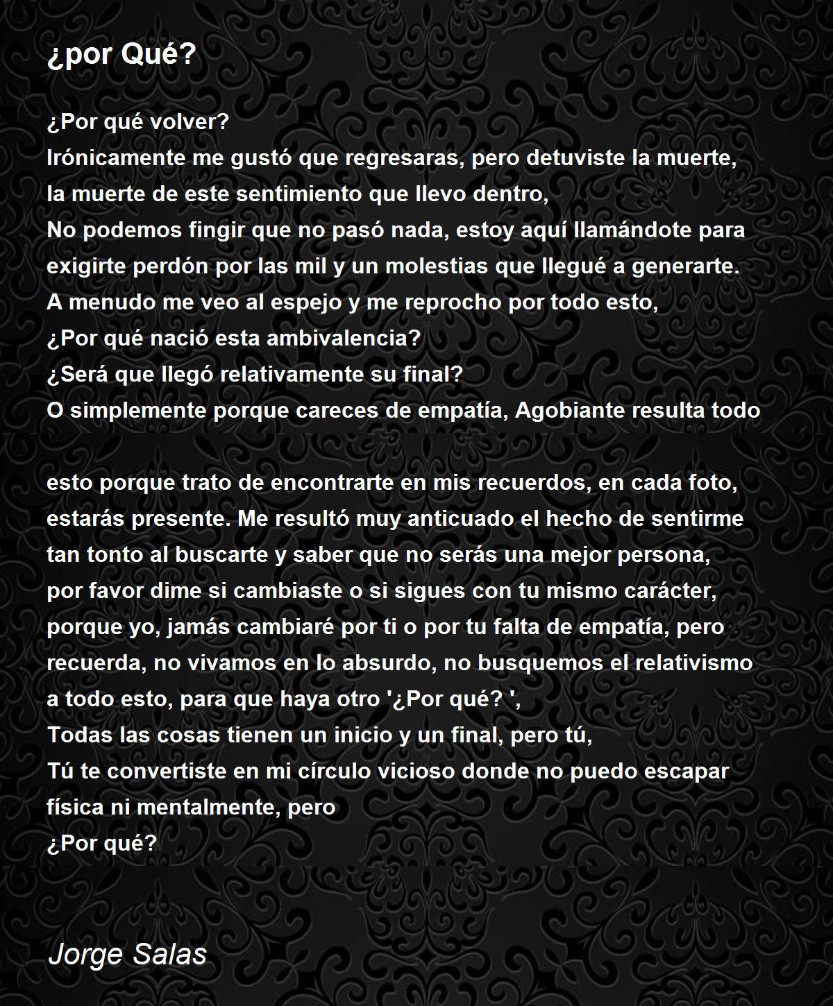 O simplemente porque careces de empatía, Agobiante resulta todo esto porque trato de encontrarte en mis recuerdos, en cada foto, estarás presente. Me resultó muy anticuado el hecho de sentirme tan tonto al buscarte y saber que no serás una mejor persona, por favor dime si cambiaste o si sigues con tu mismo carácter, porque yo, jamás cambiaré por ti o por tu falta de empatía, pero recuerda, no vivamos en lo absurdo, no busquemos el relativismo a todo esto, para que haya otro '¿Por qué? ',