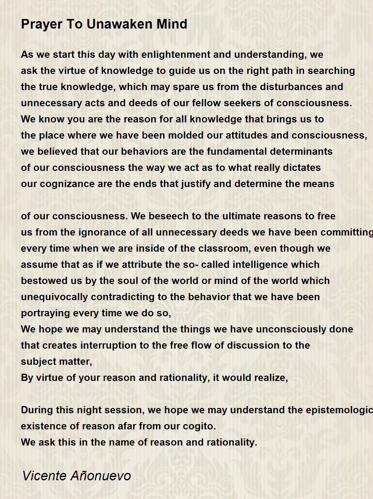 As we start this day with enlightenment and understanding, we ask the virtue of knowledge to guide us on the right path in searching the true knowledge, which may spare us from the disturbances and unnecessary acts and deeds of our fellow seekers of consciousness. We know you are the reason for all knowledge that brings us to the place where we have been molded our attitudes and consciousness, we believed that our behaviors are the fundamental determinants of our consciousness the way we act as to what really dictates our cognizance are the ends that justify and determine the means of our consciousness. We beseech to the ultimate reasons to free us from the ignorance of all unnecessary deeds we have been committing every time when we are inside of the classroom, even though we assume that as if we attribute the so-called intelligence which bestowed us by the soul of the world or mind of the world which unequivocally contradicting to the behavior that we have been portraying every time we do so,