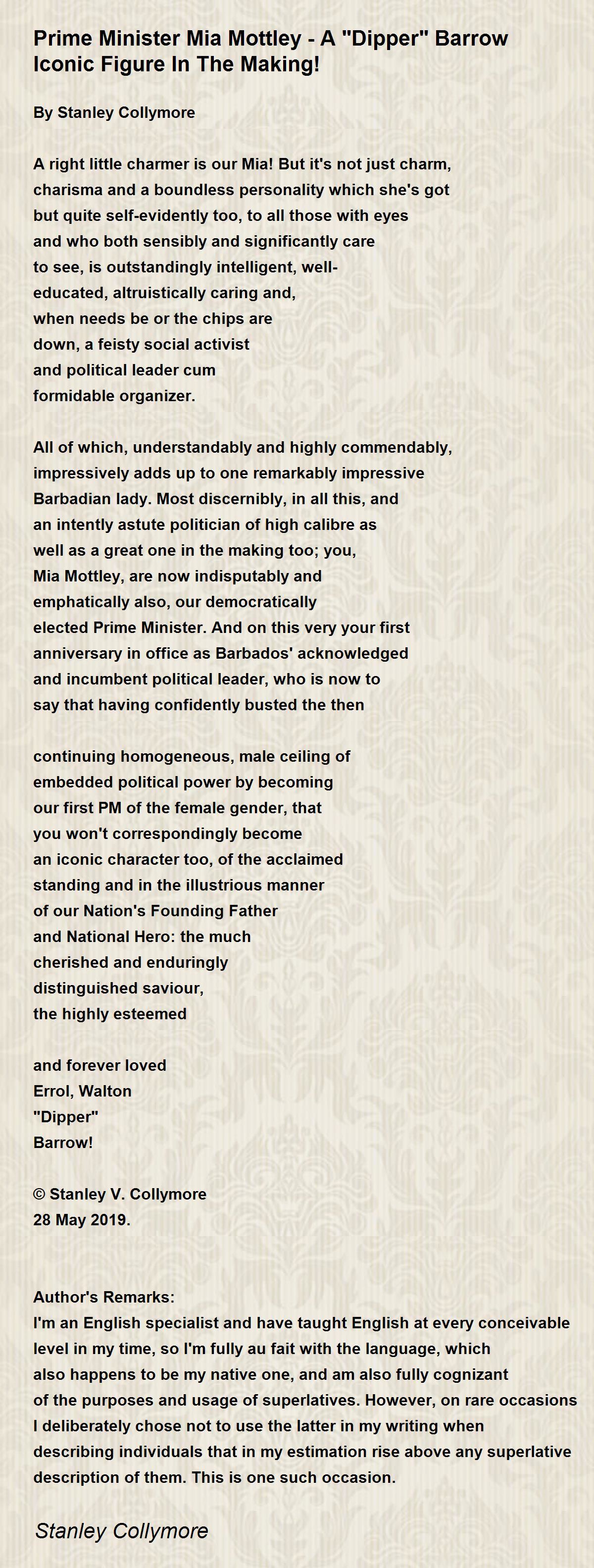 So I'll leave you to read this poem and, if you also care to and I sincerely hope that you will, you'll take a few minutes of your precious time to read the Wikipedia biography of Mia Motley, and I'm sure you'll readily come to the conclusion that I've reached that superlatives won't do this exceptional Barbadian Lady, its incumbent and first female Prime Minister, the warranted justice and earned reputation that she deserves.