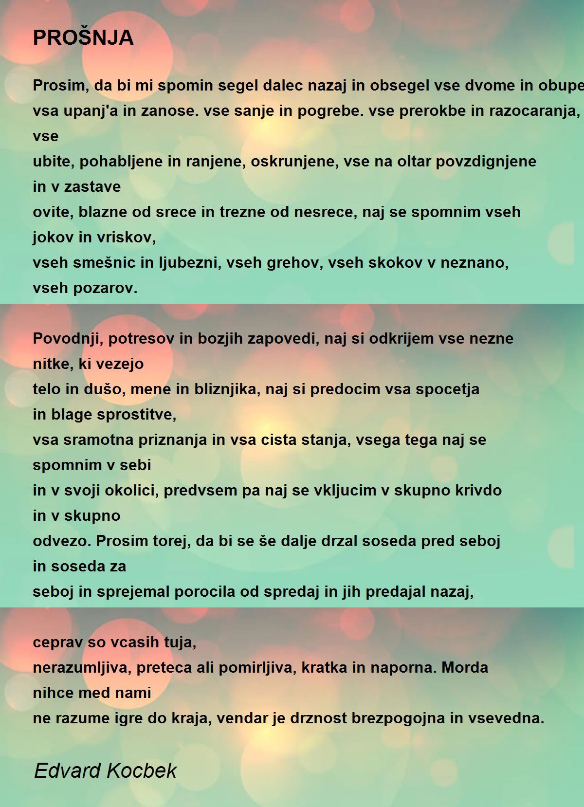 telo in dušo, mene in bliznjika, naj si predocim vsa spocetja in blage sprostitve,