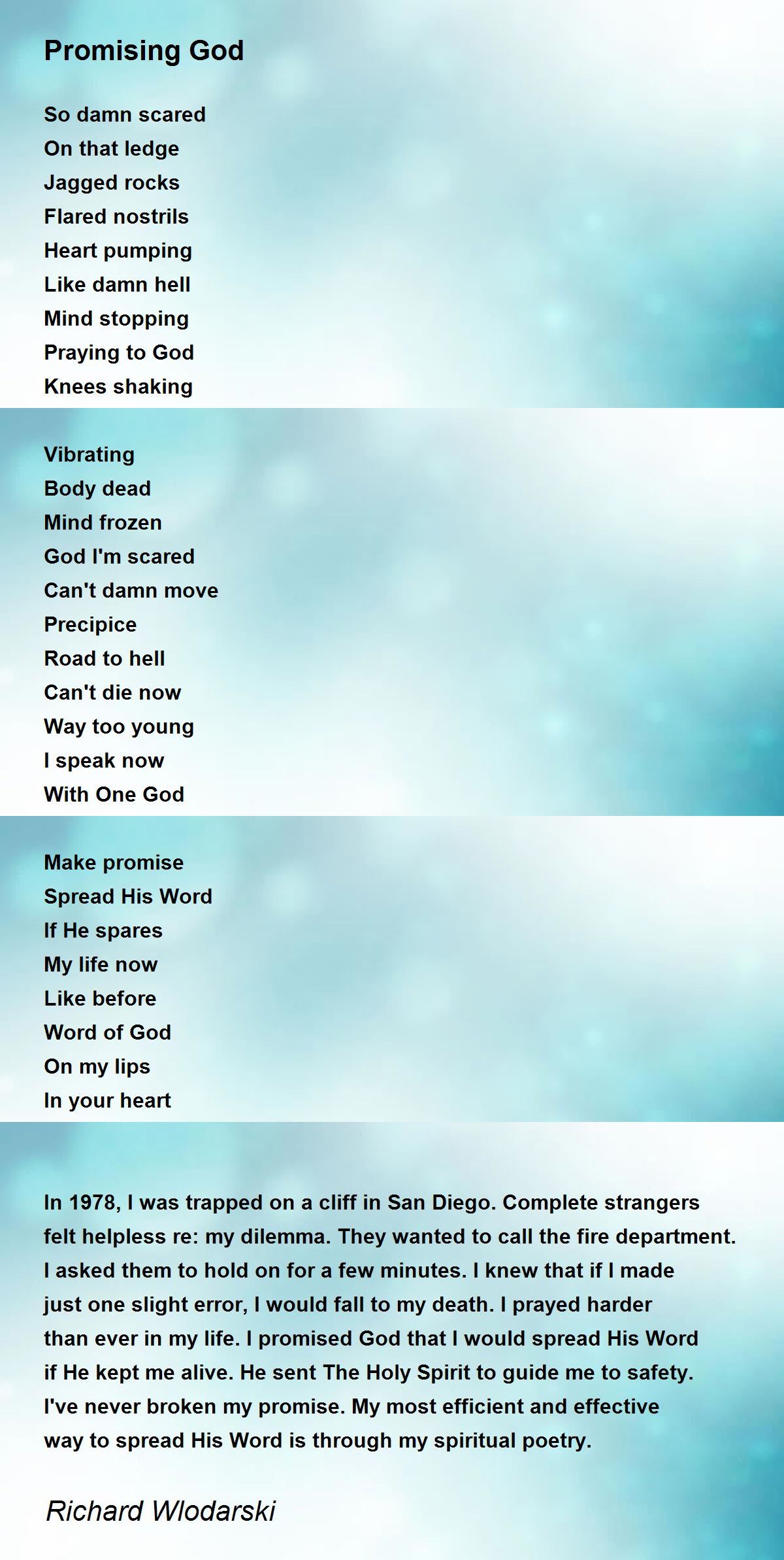 In 1978, I was trapped on a cliff in San Diego. Complete strangers felt helpless re: my dilemma. They wanted to call the fire department. I asked them to hold on for a few minutes. I knew that if I made just one slight error, I would fall to my death. I prayed harder than ever in my life. I promised God that I would spread His Word if He kept me alive. He sent The Holy Spirit to guide me to safety. I've never broken my promise. My most efficient and effective way to spread His Word is through my spiritual poetry.
