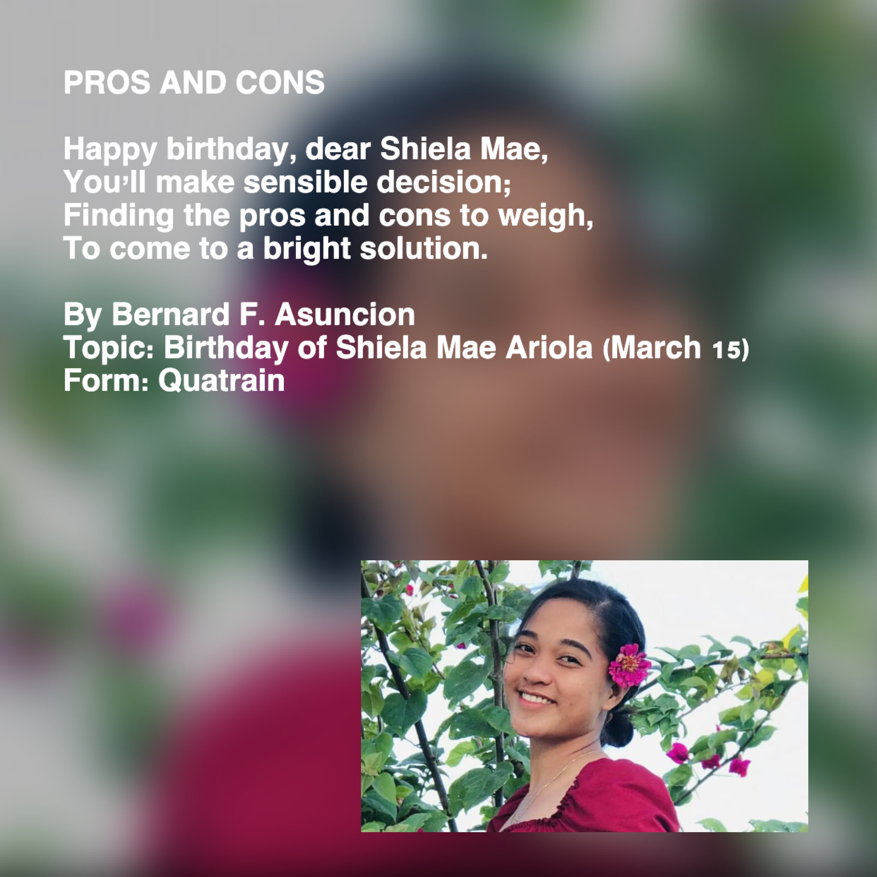 Topic: Birthday of Shiela Mae Ariola (March 15)