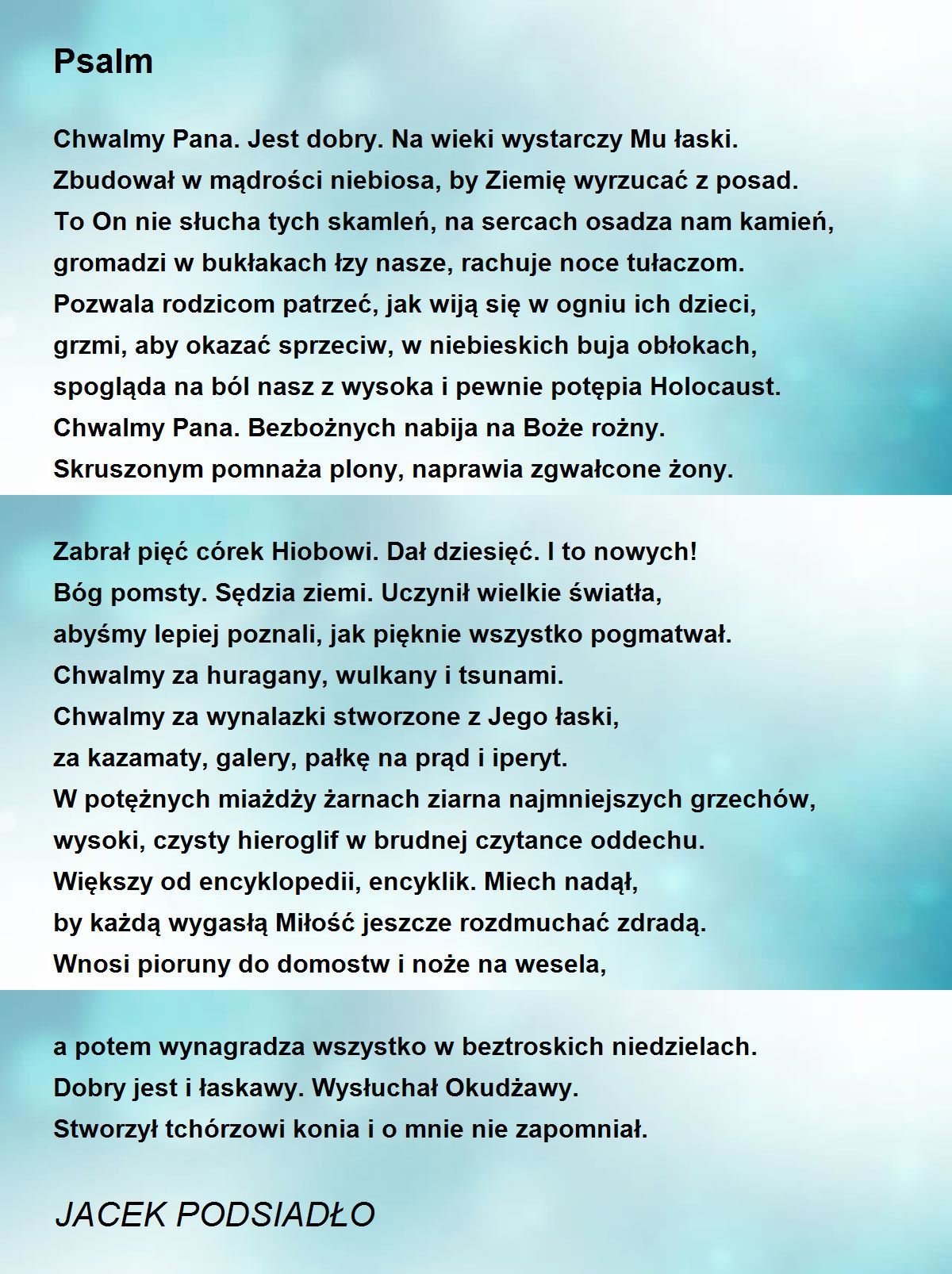 Zbudował w mądrości niebiosa, by Ziemię wyrzucać z posad.