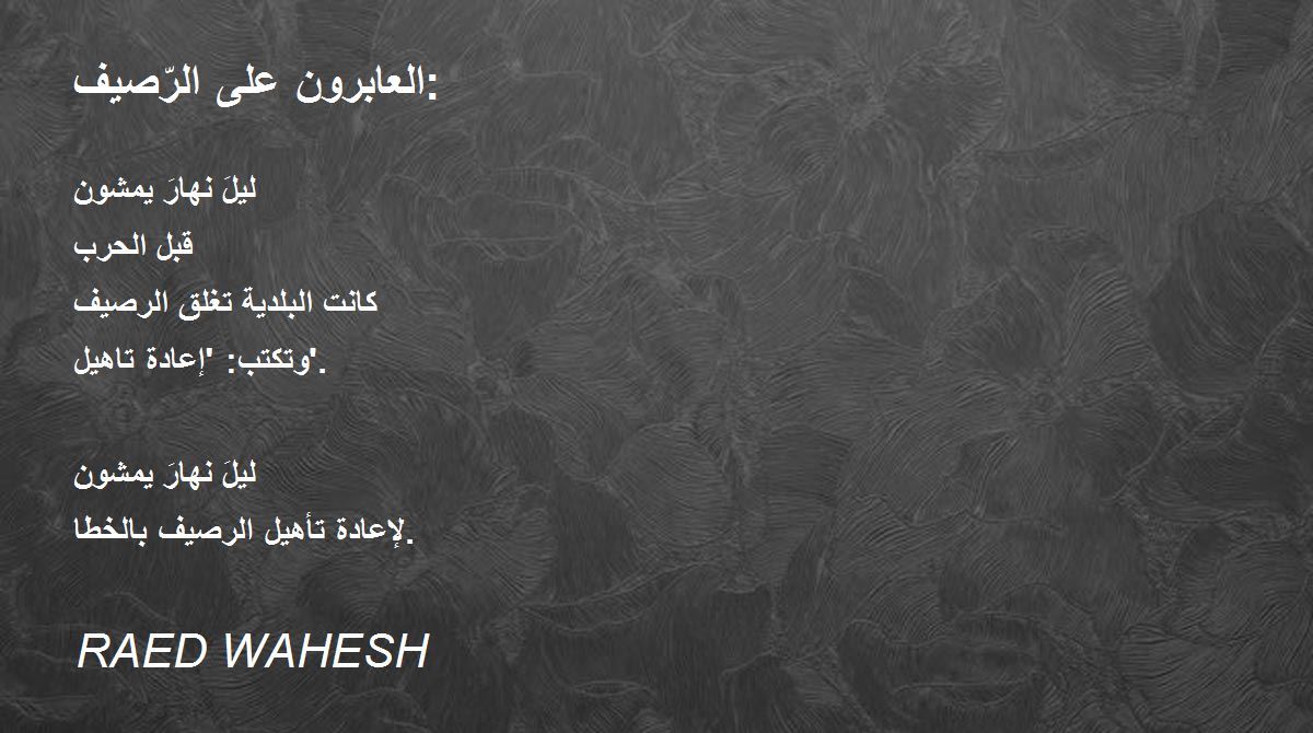 ليلَ نهارَ يمشون قبل الحرب كانت البلدية تغلق الرصيف وتكتب: 'إعادة تاهيل'. ليلَ نهارَ يمشون لإعادة تأهيل الرصيف بالخطا.