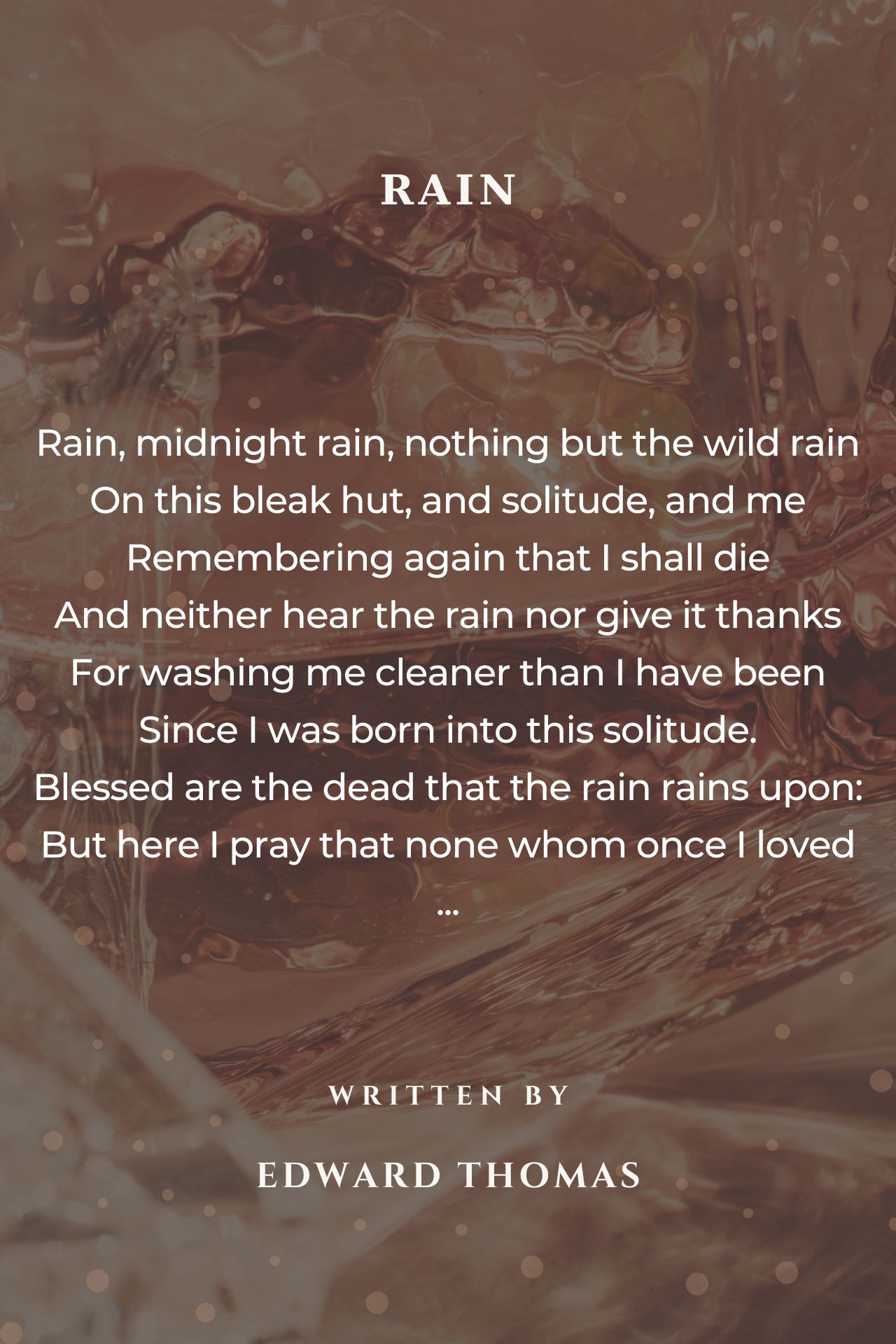 if edward thomas lived in a war, then it could be possible that the RAIN indicates the bullets. and therefore, the sound it makeson our roofs signifies the noices(gunfires here, gunfires there) Remembering again that I shall die And neither hear the rain nor give it thanks For washing me cleaner than I have been Since I was born into this solitude.. this signifies the chance to die in a war. .the 'washing me cleaner than i have been since i was born into this solitude' signifies the effect of the rain (war) to the narrator...and solitude means fear/loneliness. thus he was born in a war, or maybe live... Blessed are the dead that the rain rains upon: But here I pray that none whom once I loved Is dying to-night or lying still awake Solitary, listening to the rain, 'blessed are the dead' because they can no more experience the fear of war 'but here i pray that none whom once i loved is dying tonight'-the narrator wishes that his loved ones(family, maybe) are safe... 'or lying still awake...listening to the rain' this one signifies the wish of the narrator that no one would be wounded...if you're wounded, you can do nothing but lie, and just listen to what is happening.... 'among the living and the dead, ' signifies no exact fate in a war... Like me who have no love which this wild rain Has not dissolved except the love of death, 'the love of death' signifies the will and courage to fight. If love it be towards what is perfect and Cannot, the tempest tells me, disappoint. in this last two lines the narrator wishes that the result of the war is goodness ('perfect') and not 'disappointment'