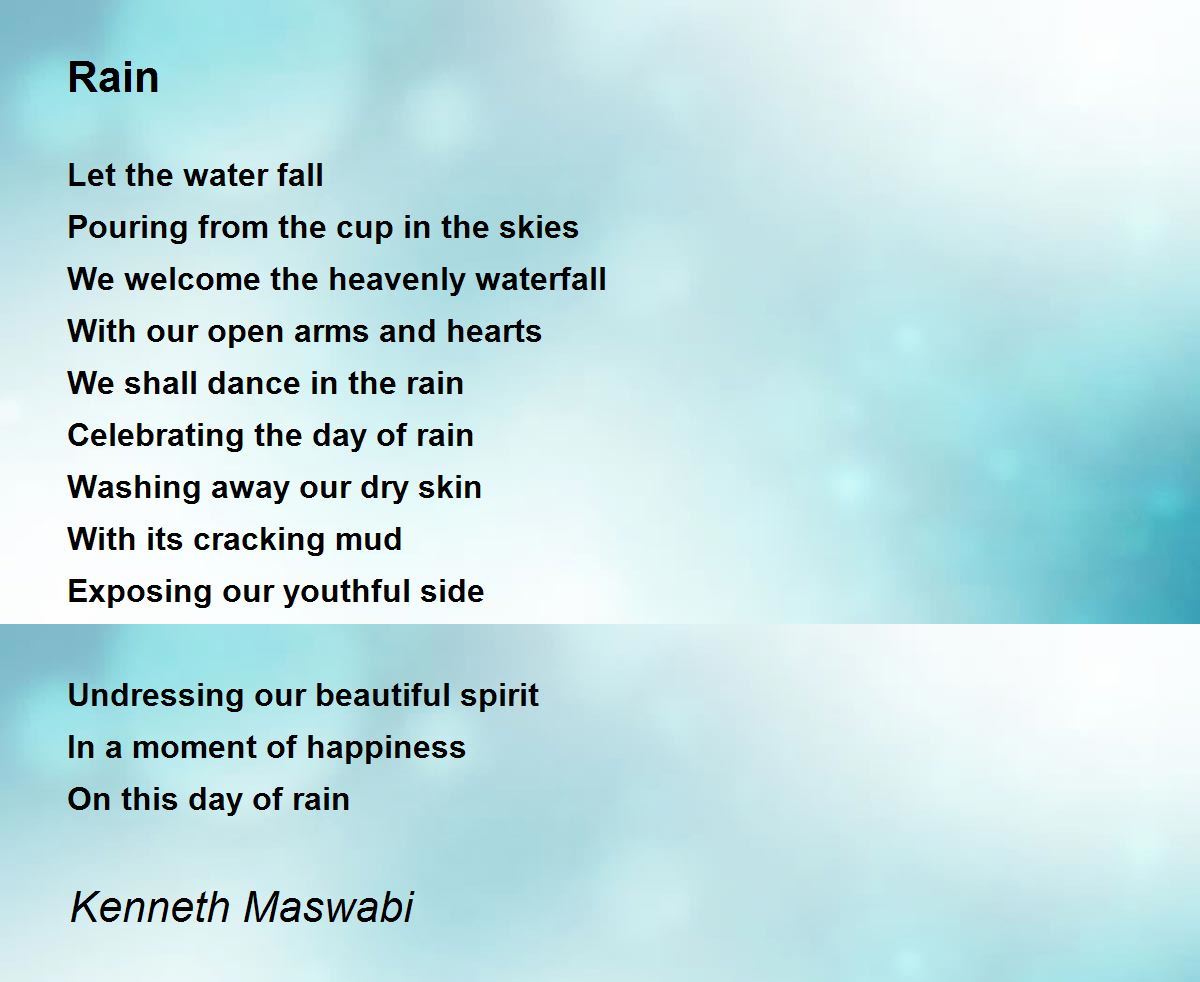Very lively and refreshing. Rain brings joy and happiness. Such is the wonderful effect of a welcome rain: We welcome the heavenly waterfall / With our open arms and hearts... / We shall dance in the rain.