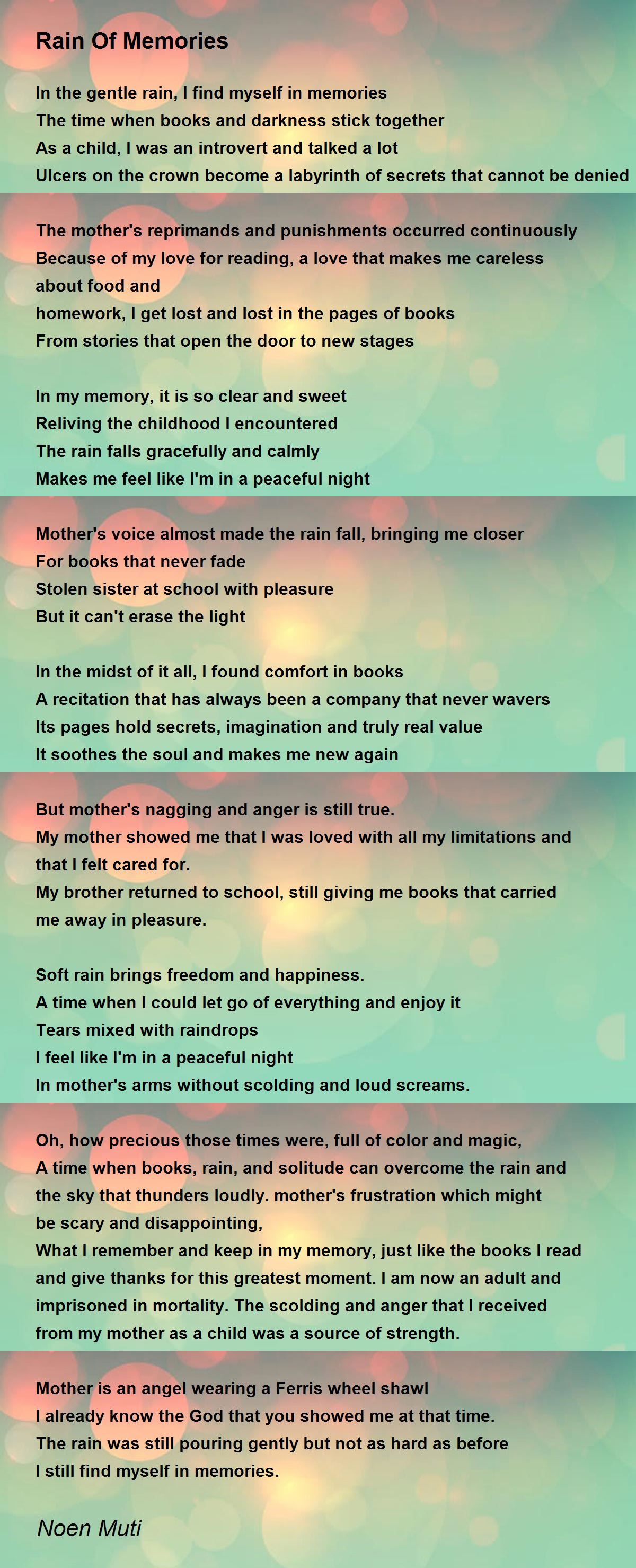 A time when books, rain, and solitude can overcome the rain and the sky that thunders loudly. mother's frustration which might be scary and disappointing,
