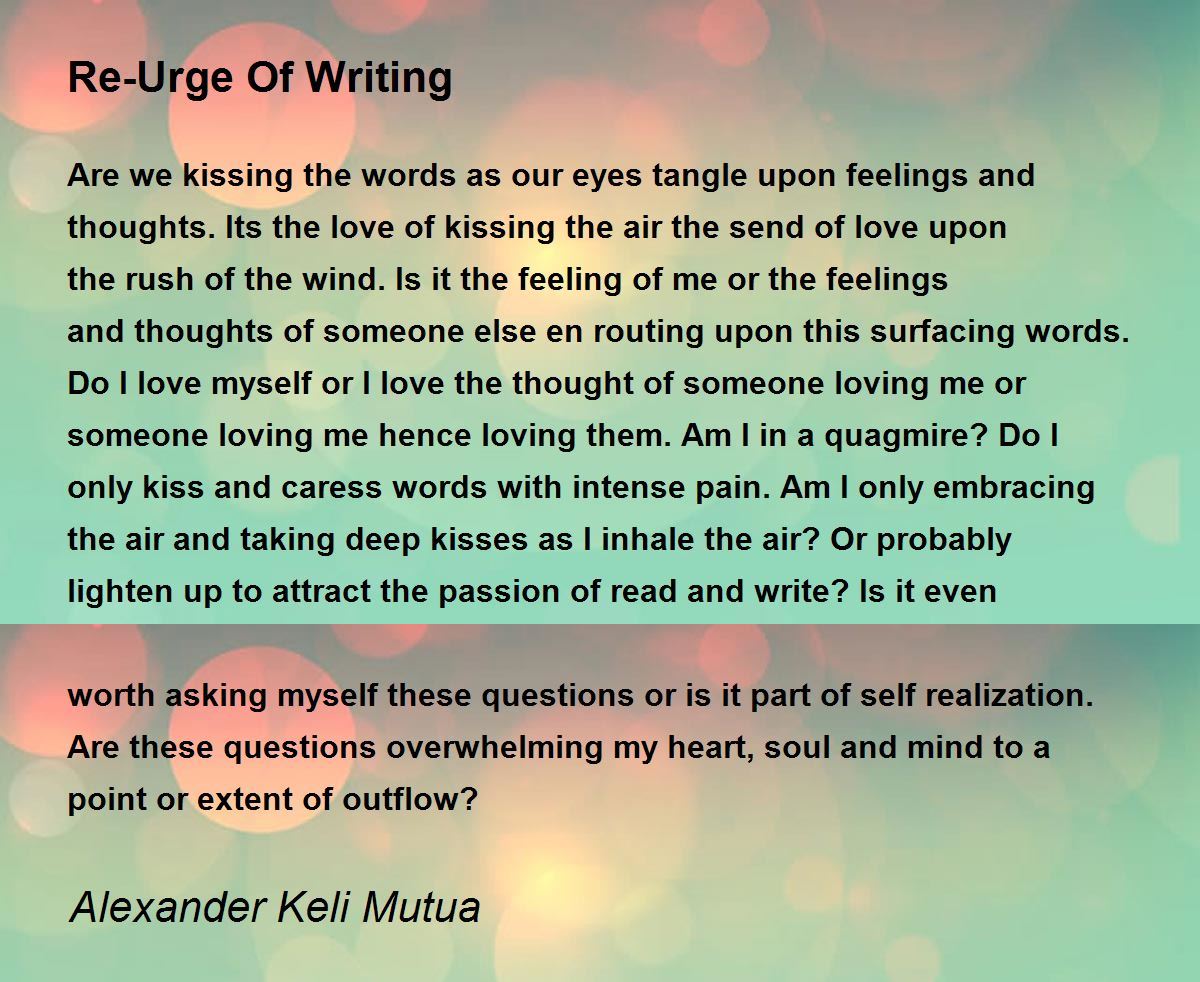 Are we kissing the words as our eyes tangle upon feelings and thoughts. Its the love of kissing the air the send of love upon the rush of the wind. Is it the feeling of me or the feelings and thoughts of someone else en routing upon this surfacing words. Do I love myself or I love the thought of someone loving me or someone loving me hence loving them. Am I in a quagmire? Do I only kiss and caress words with intense pain. Am I only embracing the air and taking deep kisses as I inhale the air? Or probably lighten up to attract the passion of read and write? Is it even worth asking myself these questions or is it part of self realization. Are these questions overwhelming my heart, soul and mind to a point or extent of outflow?